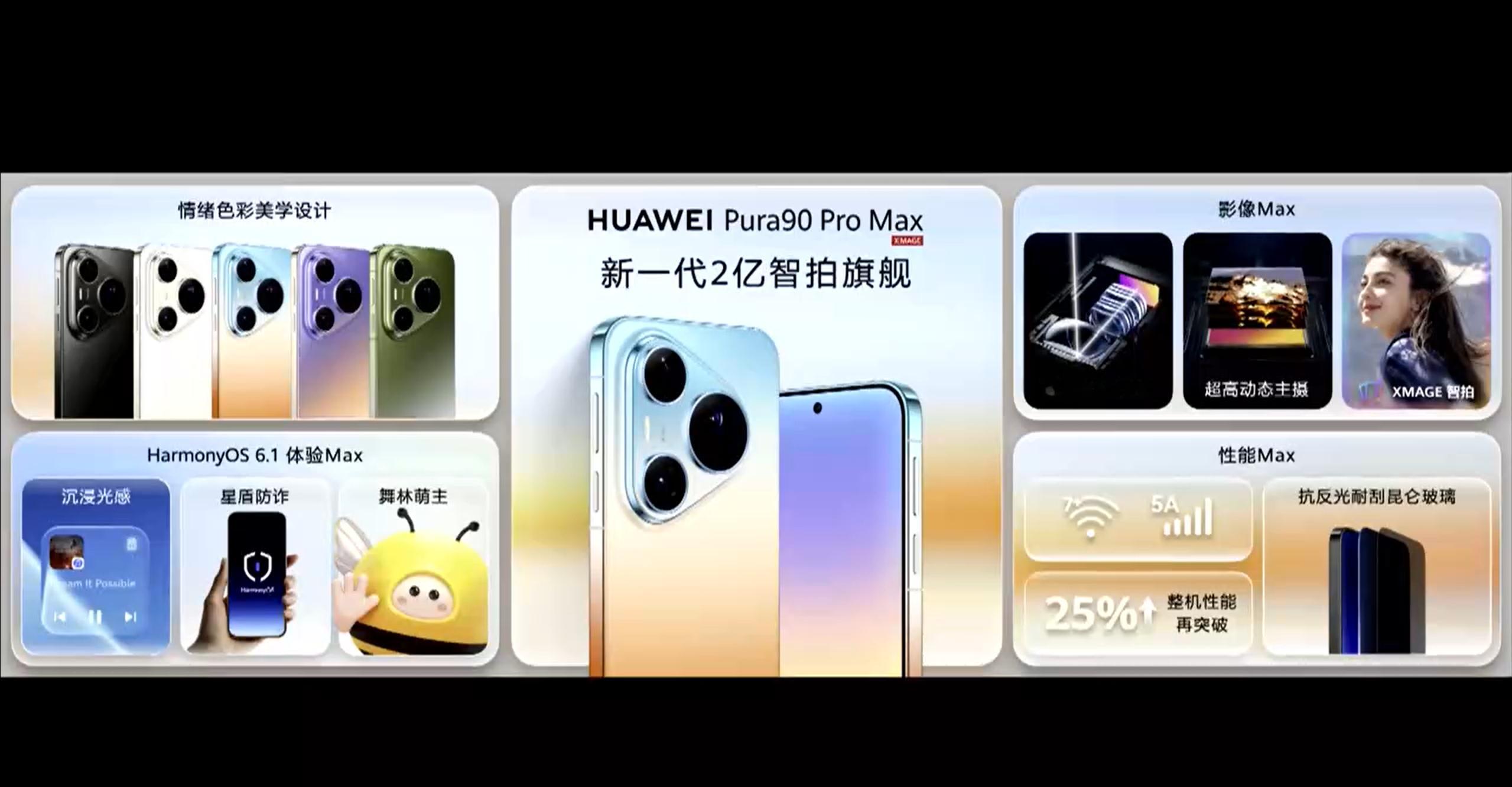 -华为 Pura 90 Pro Max6.9英寸昆仑玻璃直屏,五款配色 + 渐变中框2亿像素 RYYB 潜望长焦,进光量大幅提升十档可变光圈主摄,三合一超聚光棱镜CIPA7.0级别防抖,支持长焦微距与3.3X增距镜第二代红枫原色摄像头