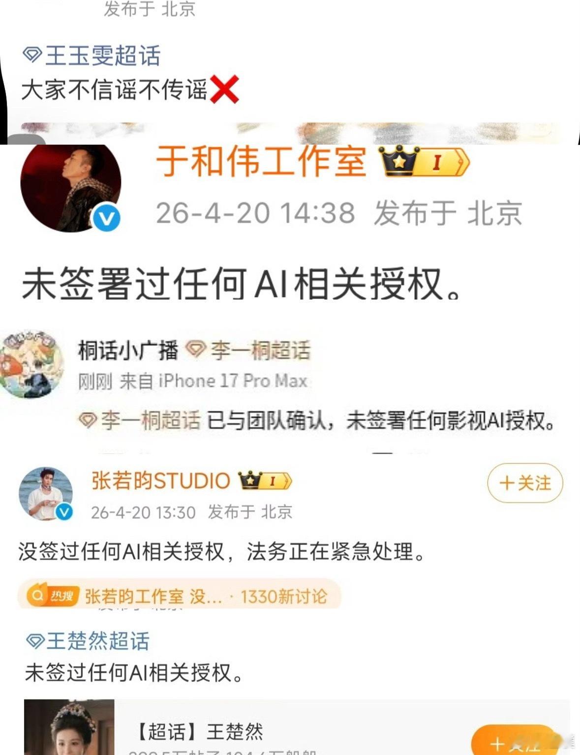 张若昀、于和伟、王楚然、李一桐、王玉雯都发文辟谣了张若昀工作室 没签过AI授权 未授权AI艺人
