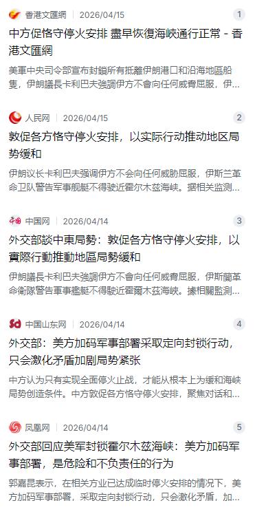 到了4月14日,中方的态度更进一步升级。当天外交部例行记者会上,有记者问到美军封锁霍尔木兹海峡的具体情况,郭嘉昆的回答非常明确。他表示,在相关方已经达成临时停火安排的情况下,美方加码军事部署,采取定向封锁行动,只会激化矛盾,加剧局势紧张,破坏本就脆弱的停火局面,并进一步冲击海峡通行安全。他直接给美国的行为定了性:这是危险和不负责任的行为。