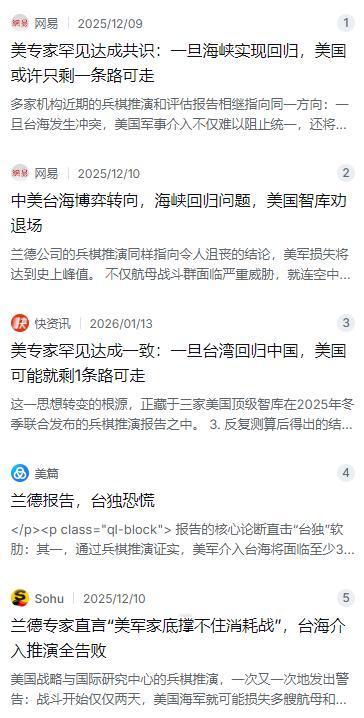 两岸统一这个大趋势,谁都挡不住。中国有这个决心,也有这个能力。美国智库那些专家现在算是看明白了,与其硬碰硬把自己搭进去,不如体面地退一步。这大概是他们在台海问题上,能做出的最理性的选择了。