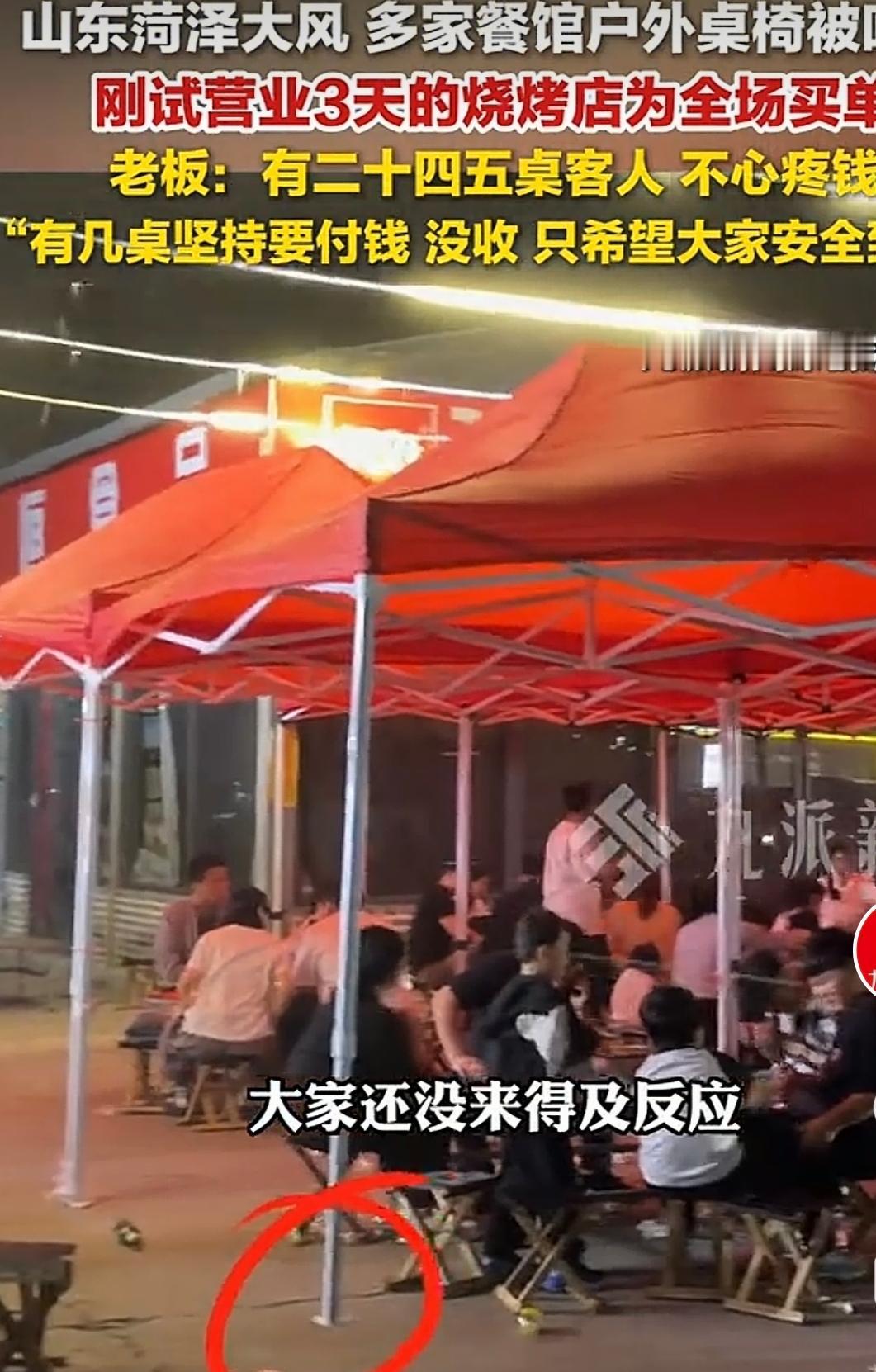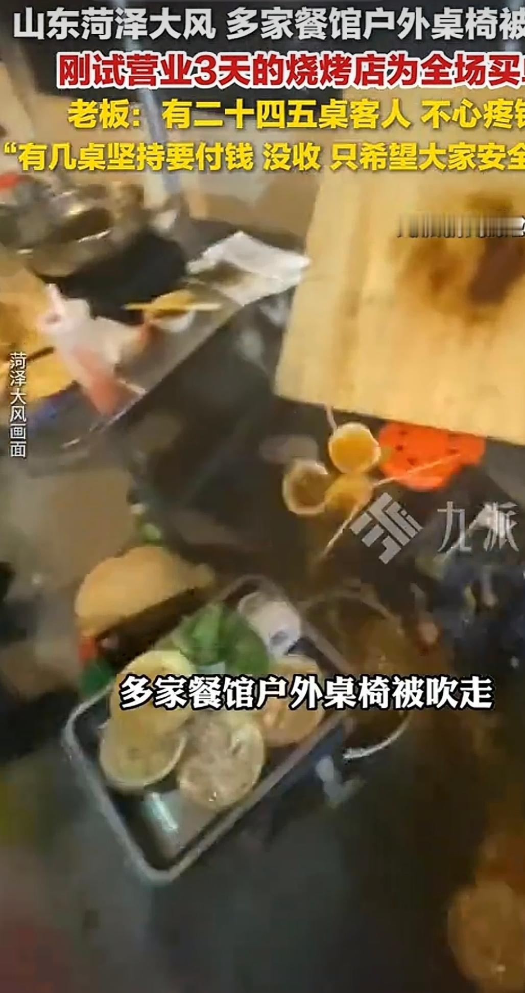 山东菏泽,一家夜宵店,生意很好,25桌的客人吃着夜宵,突然史无前例的大风吹来,把所有的餐桌餐椅全部吹跑了,现场一片狼藉,当大家措手不及时,老板做出一个大胆的举动,全部免单,不心疼钱,只要大家安全回家就行了,网友纷纷举起大拇指说:这老板的格局,以后肯定生意做得好。