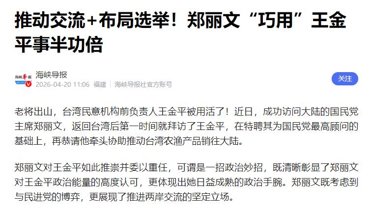 这可不是走形式,明眼人一看就懂,她是把王金平这位老将用活了,既推进了两岸交流,又悄悄为以后的选举铺路,一步操作,两头沾光,太省事、太管用了。