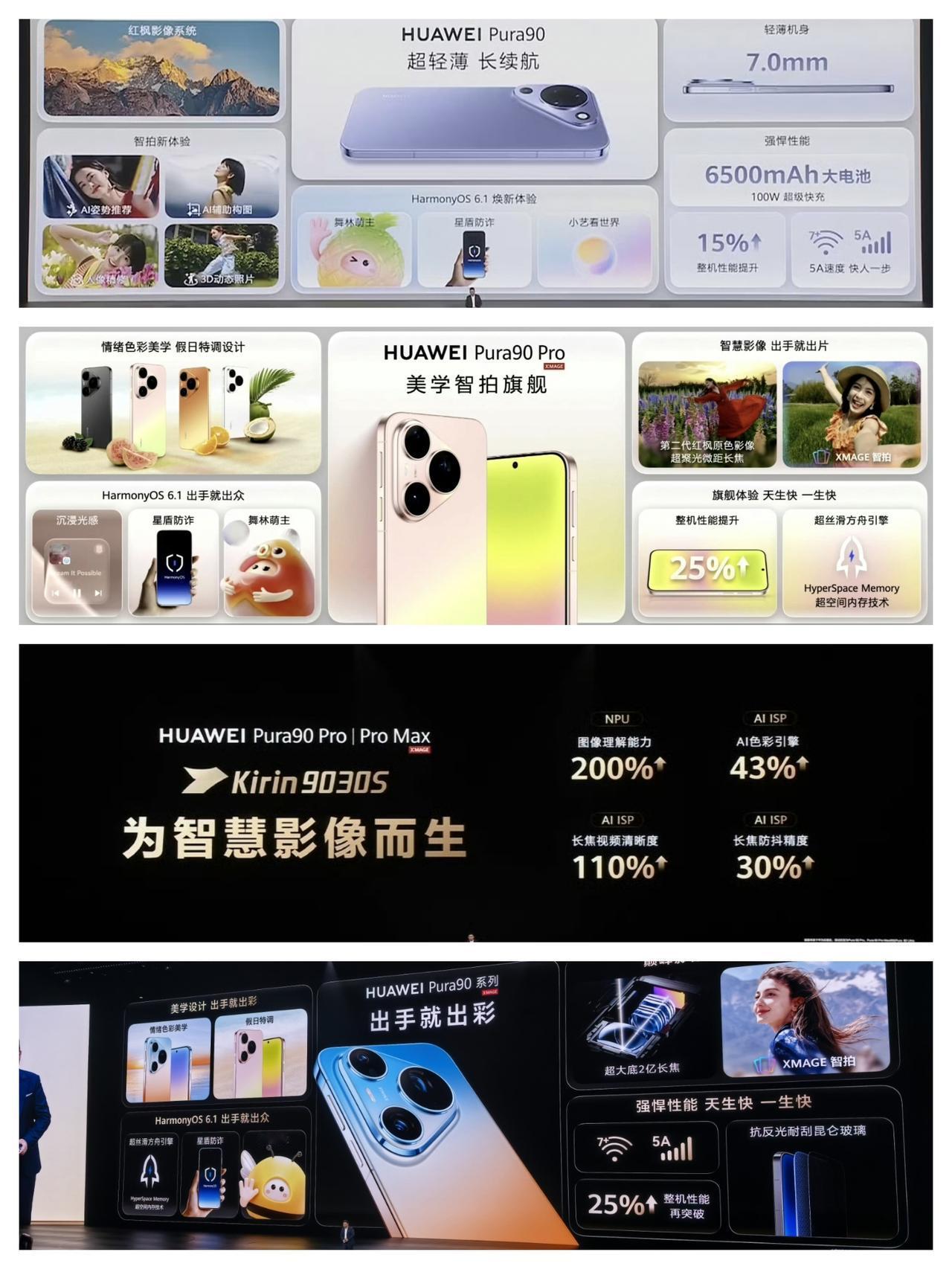 标配12GB内存,高配16GB内存。其中,华为Pura90 Pro和华为Pura90 Pro Max搭载的是海思麒麟9030S芯片。
