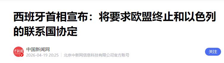 为西班牙点赞!4月19日,西班牙首相桑切斯宣布,将在明天21日欧盟外长会上,正式要求欧盟,终止与以色列的联系国协定。他说“一个违反国际法和欧盟原则的政府,不能成为欧盟的合作伙伴”。