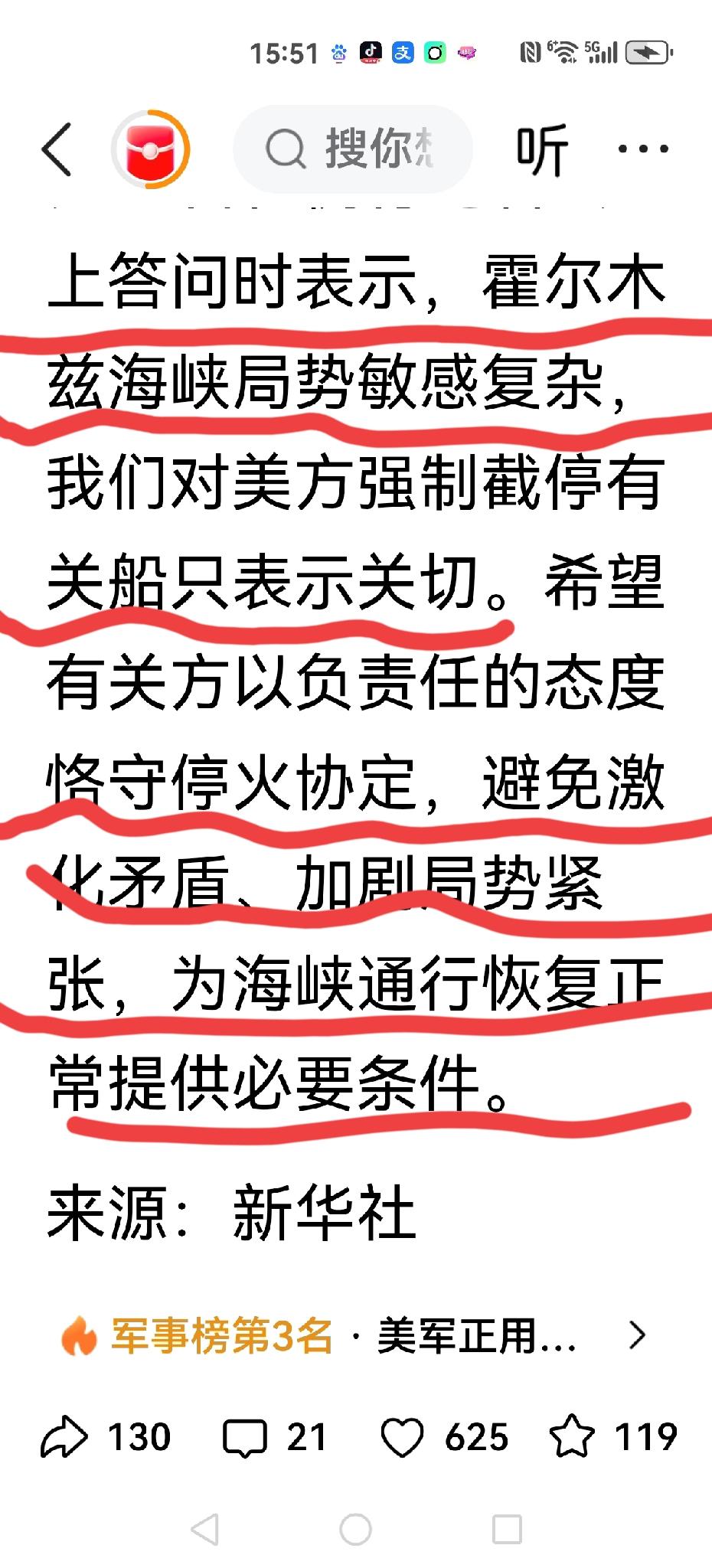 希望有关方以负责任的态度恪守停火协定,避免激化矛盾、加剧局势紧张,为海峡通行恢复正常提供必要条件。