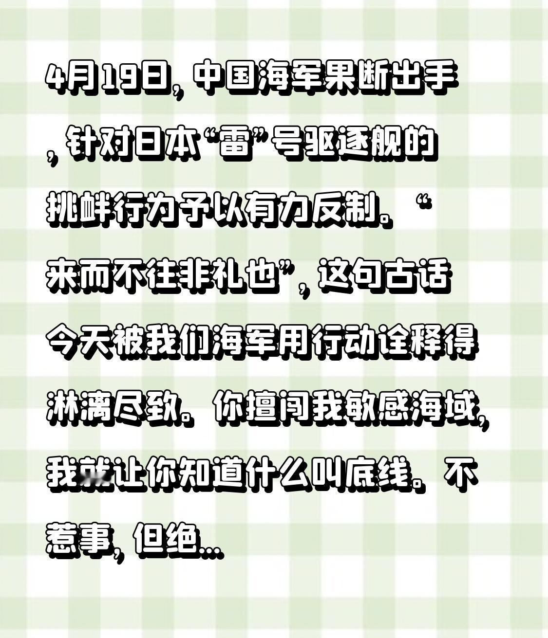 4月19日,中国海军果断出手,针对日本“雷”号驱逐舰的挑衅行为予以有力反制。“来而不往非礼也”,这句古话今天被我们海军用行动诠释得淋漓尽致。你擅闯我敏感海域,我就让你知道什么叫底线。不惹事,但绝不怕事。这才是大国该有的态度。中国海军 反制日本