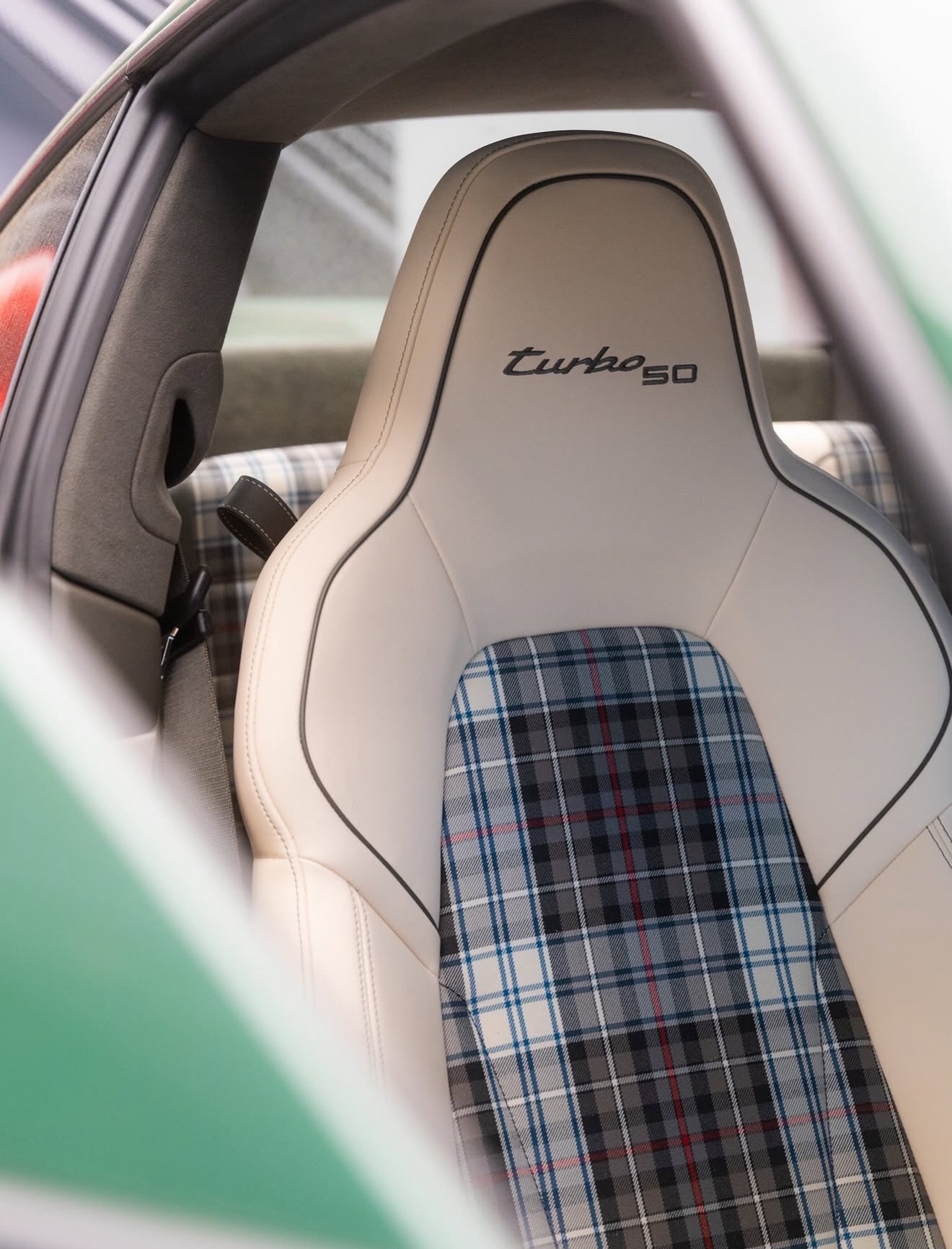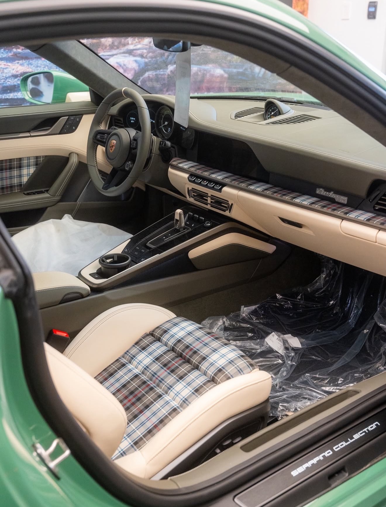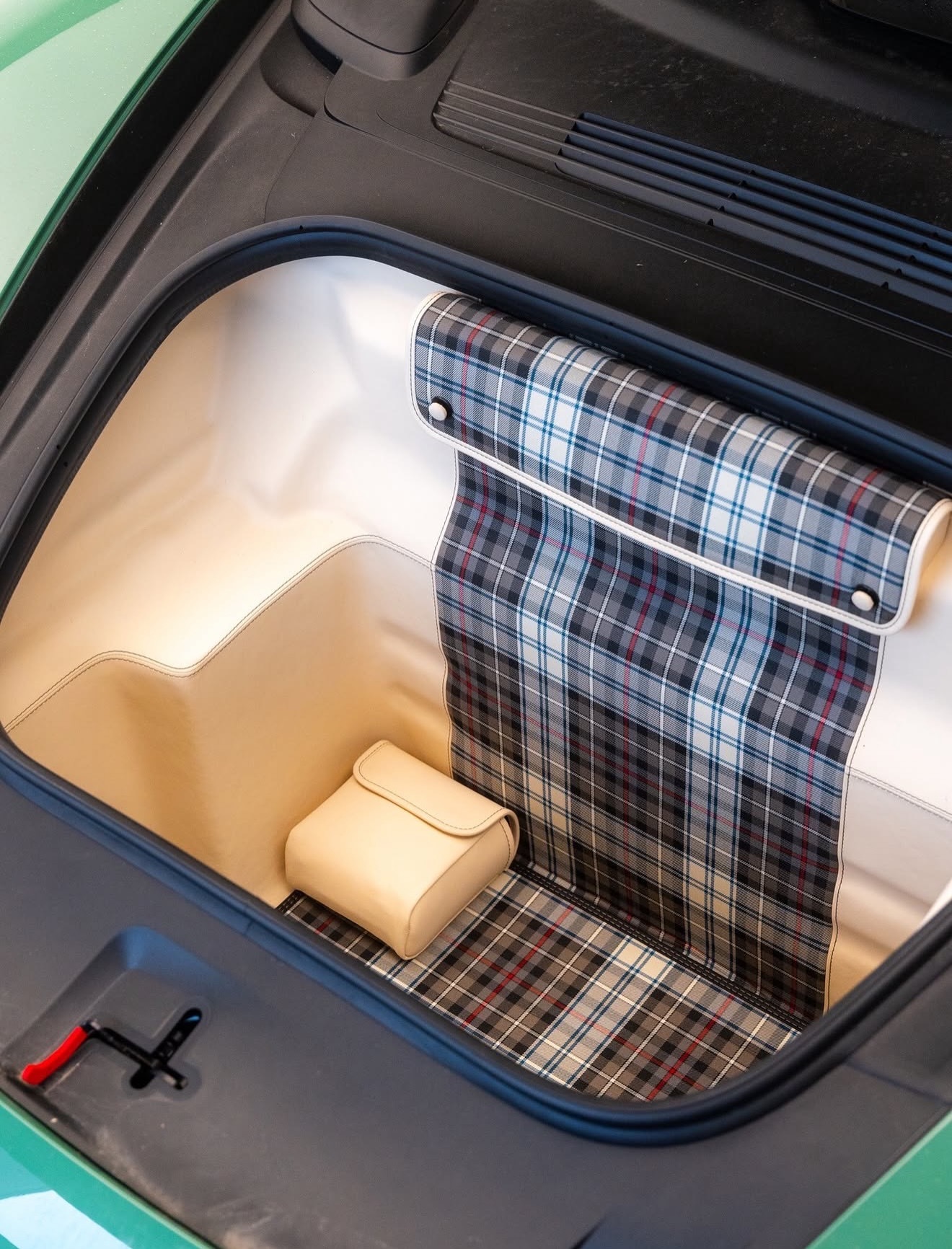 这辆车配备了 Crème White 轮毂、黑色刹车卡钳、Crème White 涂装,以及 Agave Green 与奶油色皮革内饰,并点缀着 MacKenzie Tartan 格纹元素。