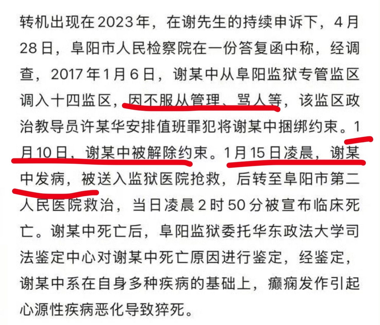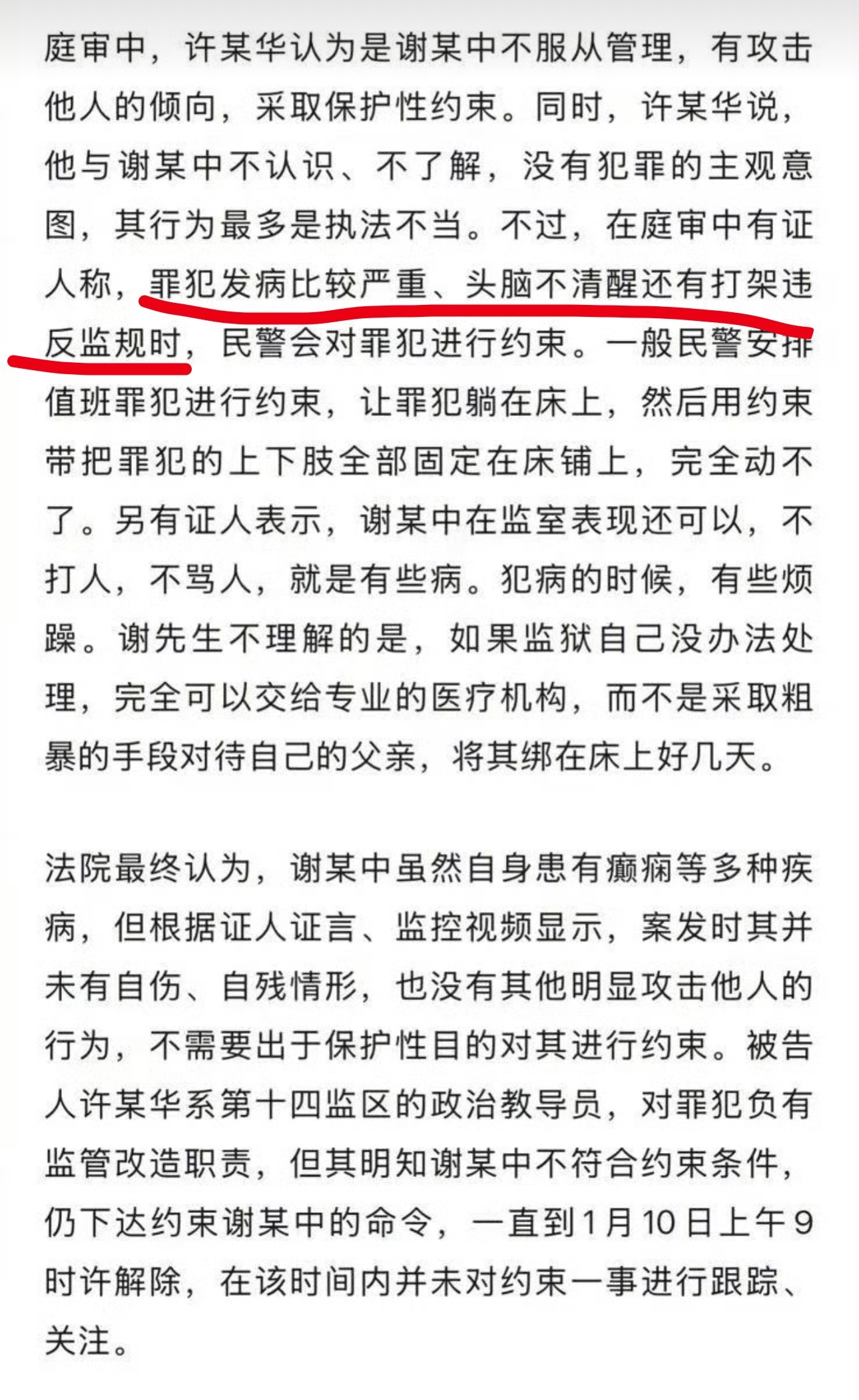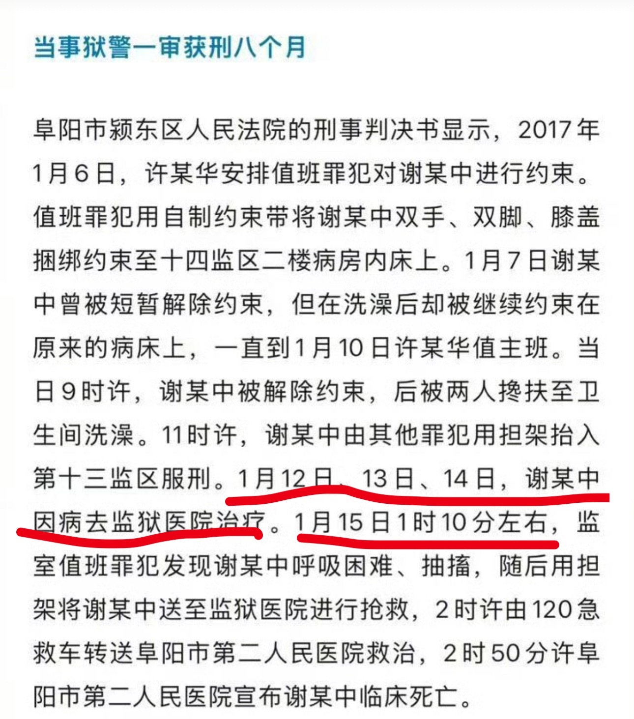 然后,事发当天,因为不服从管理、骂人,被狱警捆绑约束,约束时间从1月6日到10日,中间曾经短暂解除约束。1月12、13、14日还去医院进行了治疗,直到1月15日凌晨,约束解除后的5天后,因为病发最终导致死亡。