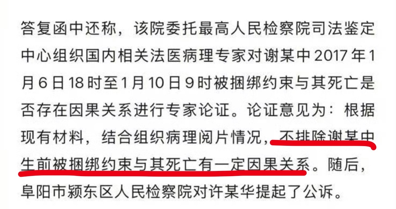 至于约束和病发的因果关系,专家论证意见为:不排除生前捆绑约束与其死亡有一定因果关系。