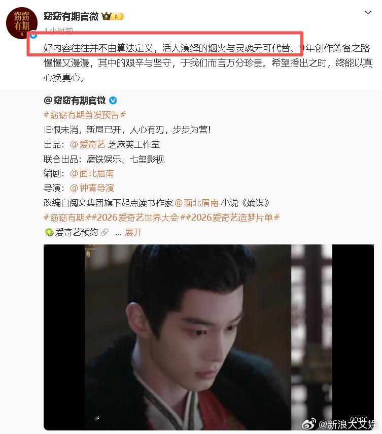 窈窈有期 硬刚爱奇艺窈窈有期官微发文 爱奇艺旗下剧《窈窈有期》官微发文:“好内容往往并不由算法定义,活人演绎的烟火与灵魂无可代替。”这是对爱奇艺的AI策略表示不满吗?