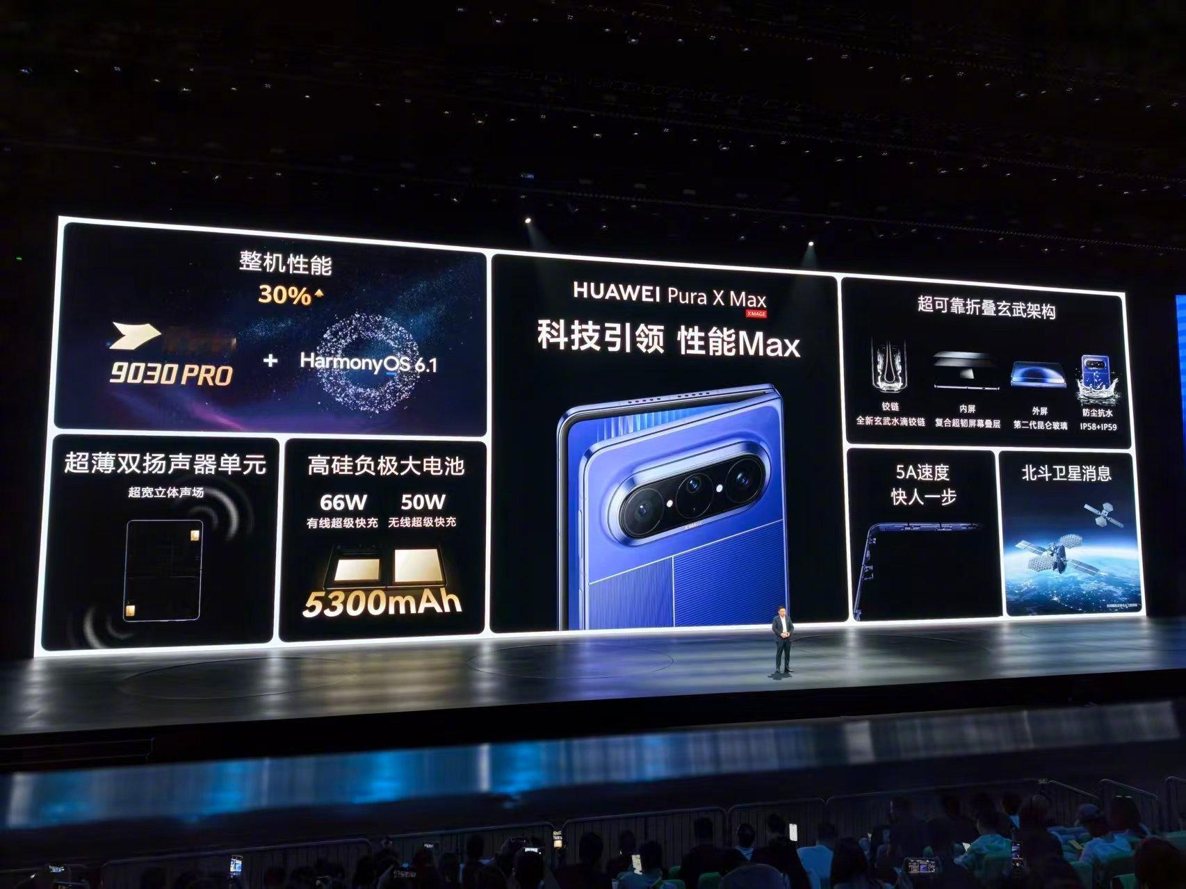 华为Pura X Max搭载麒麟9030 Pro和HarmonyOS 6.1,官方称整机性能提升30%,同时配备5300mAh高硅负极大电池,支持66W有线超级快充和50W无线超级快充,并搭载超薄双扬声器单元、北斗卫星消息和5A速度。整机还采用超可靠折叠玄武架构,包含全新玄武水滴铰链、复合超韧屏幕层、第二代昆仑玻璃,支持IP58+IP59防尘防水华为阔折叠切大号了