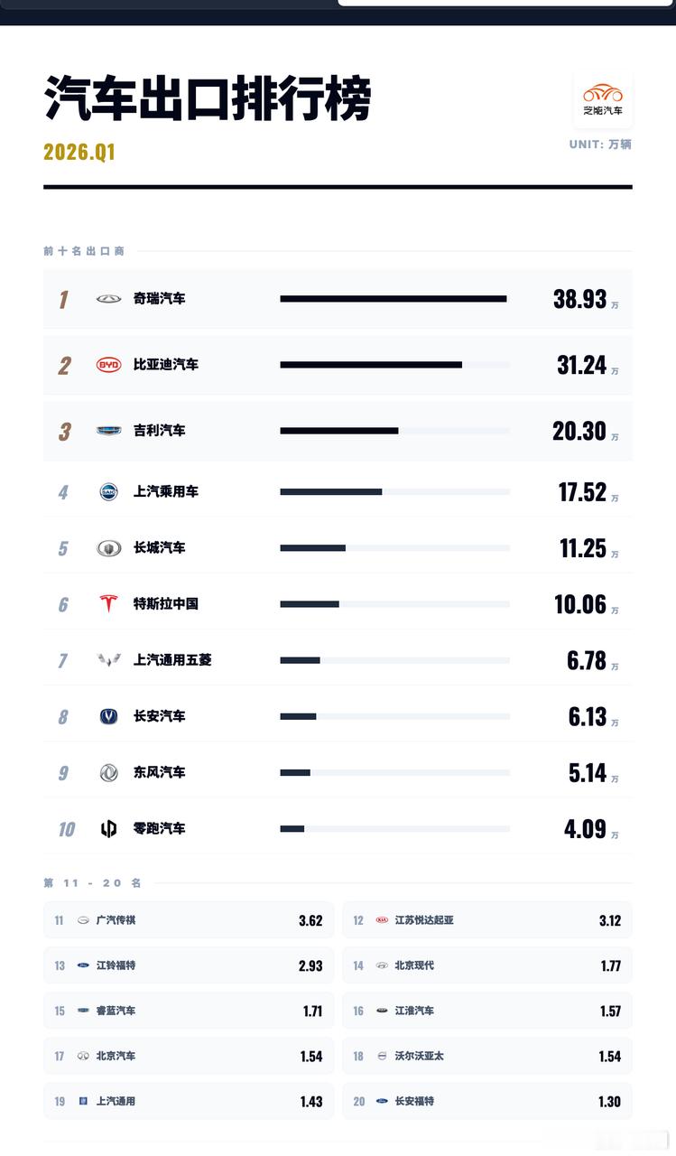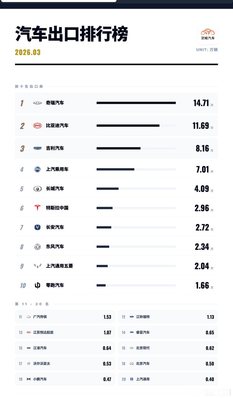 3月奇瑞单月14.7万辆,比亚迪11.7万辆,吉利8.1万辆,上汽乘用车出口量为7万台。