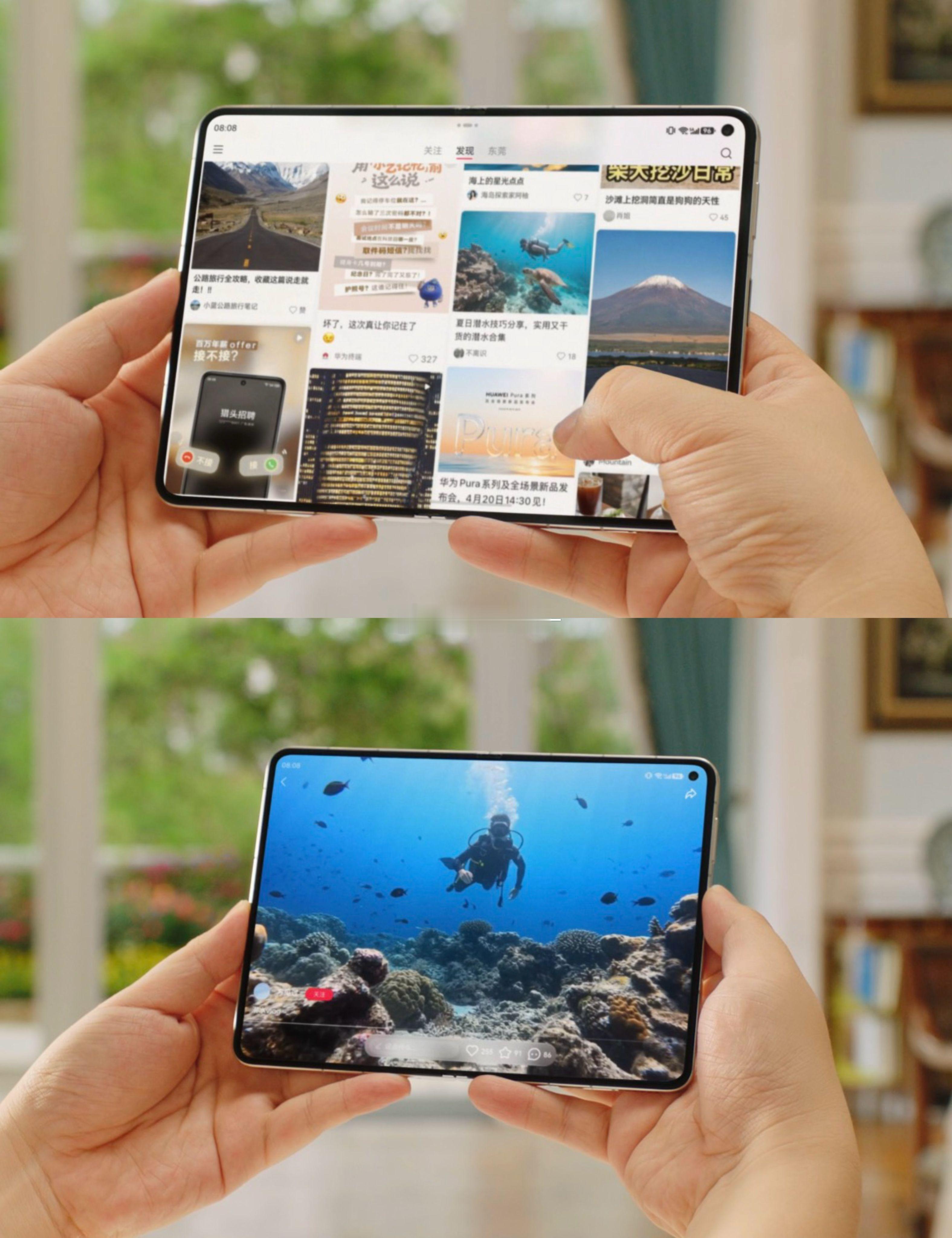 全球首款大阔折正式发布华为全球首款大阔折Pura X Max发布,外屏5.5英寸单手好握,内屏7.69英寸16:10阔屏,观影办公更沉浸,折叠形态全面升级。华为阔折叠切大号了