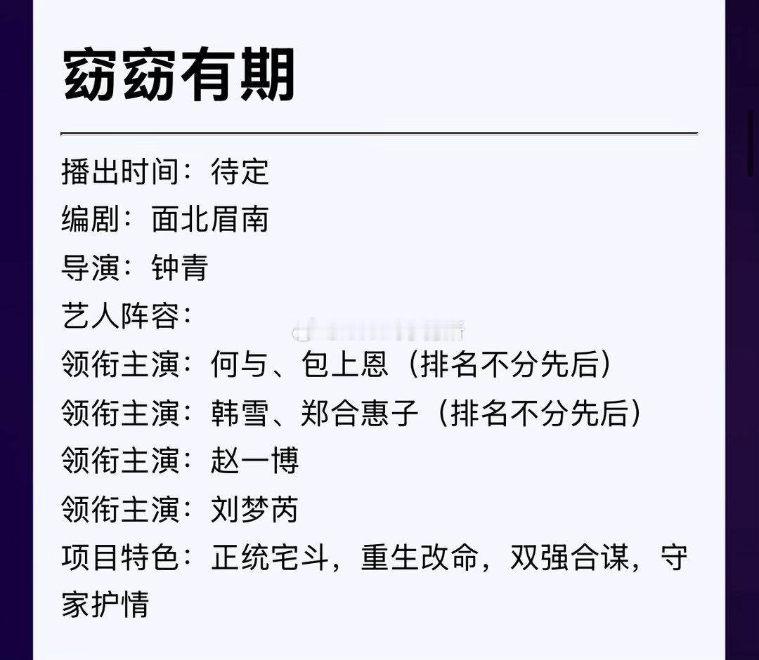 何与、包上恩(排名不分先后)《窈窈有期》项目特色:正统宅斗,重生改命,双强合谋,
