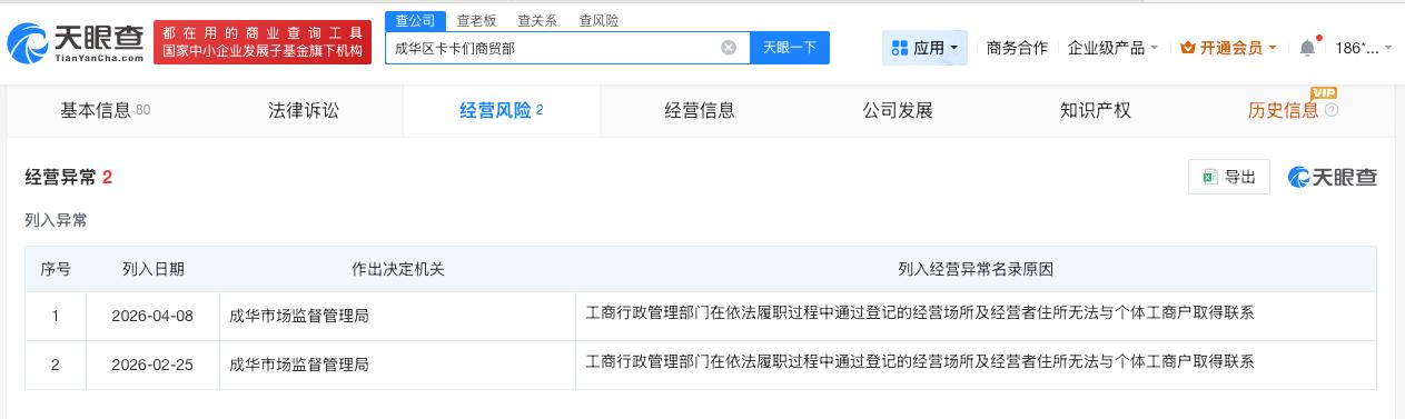 天眼查App显示,近日,成华区卡卡们商贸部因通过登记的经营场所及经营者住所无法联系,被成华市场监督管理局列入经营异常名录。