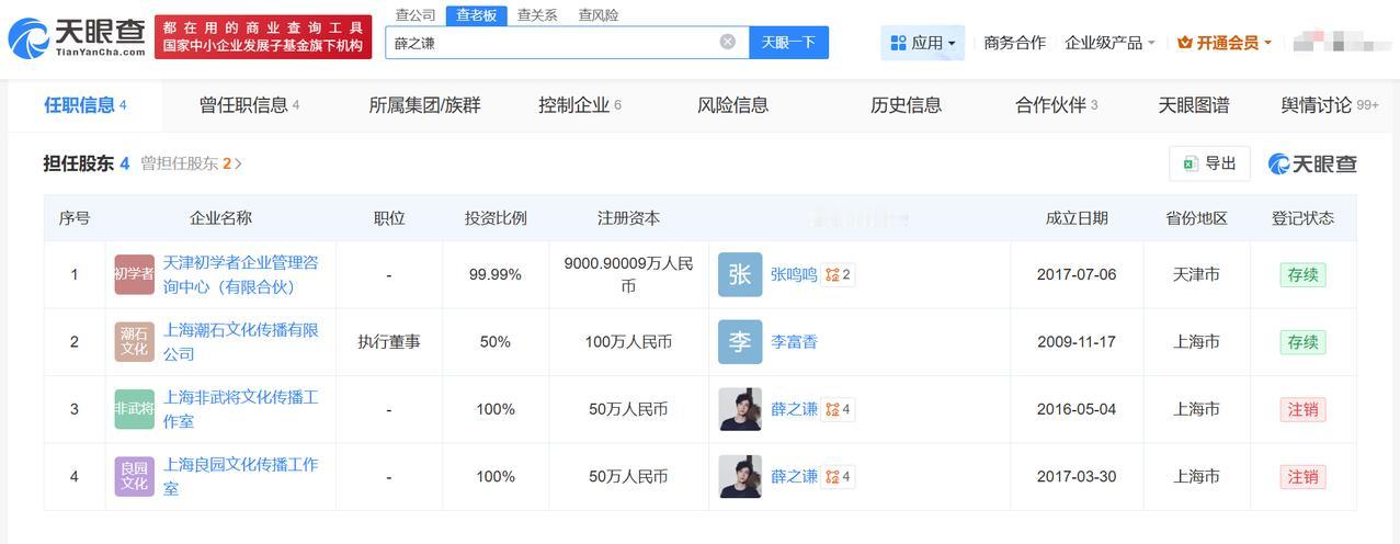 天眼查App显示,薛之谦名下关联4家企业,其中2家为存续状态,包括天津初学者企业管理咨询中心(有限合伙)、上海潮石文化传播有限公司,此外,上海非武将文化传播工作室、上海良园文化传播工作室已注销。