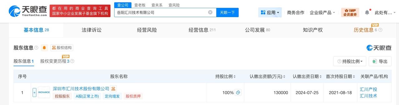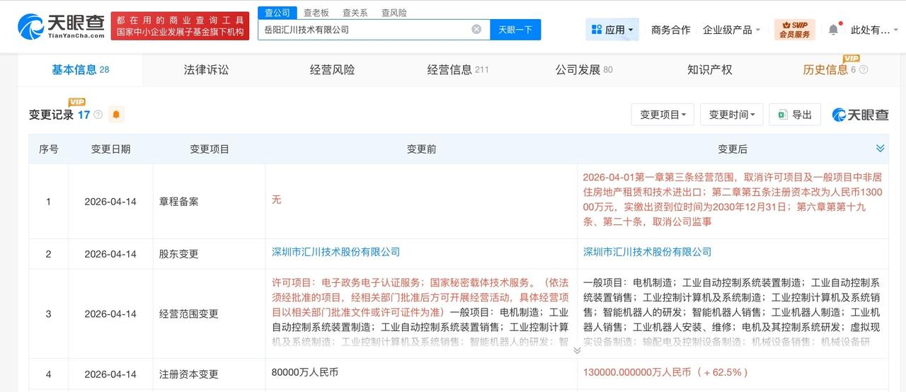天眼查App显示,近日,岳阳汇川技术有限公司发生工商变更,注册资本由8亿人民币增至13亿人民币,增幅62.5%。