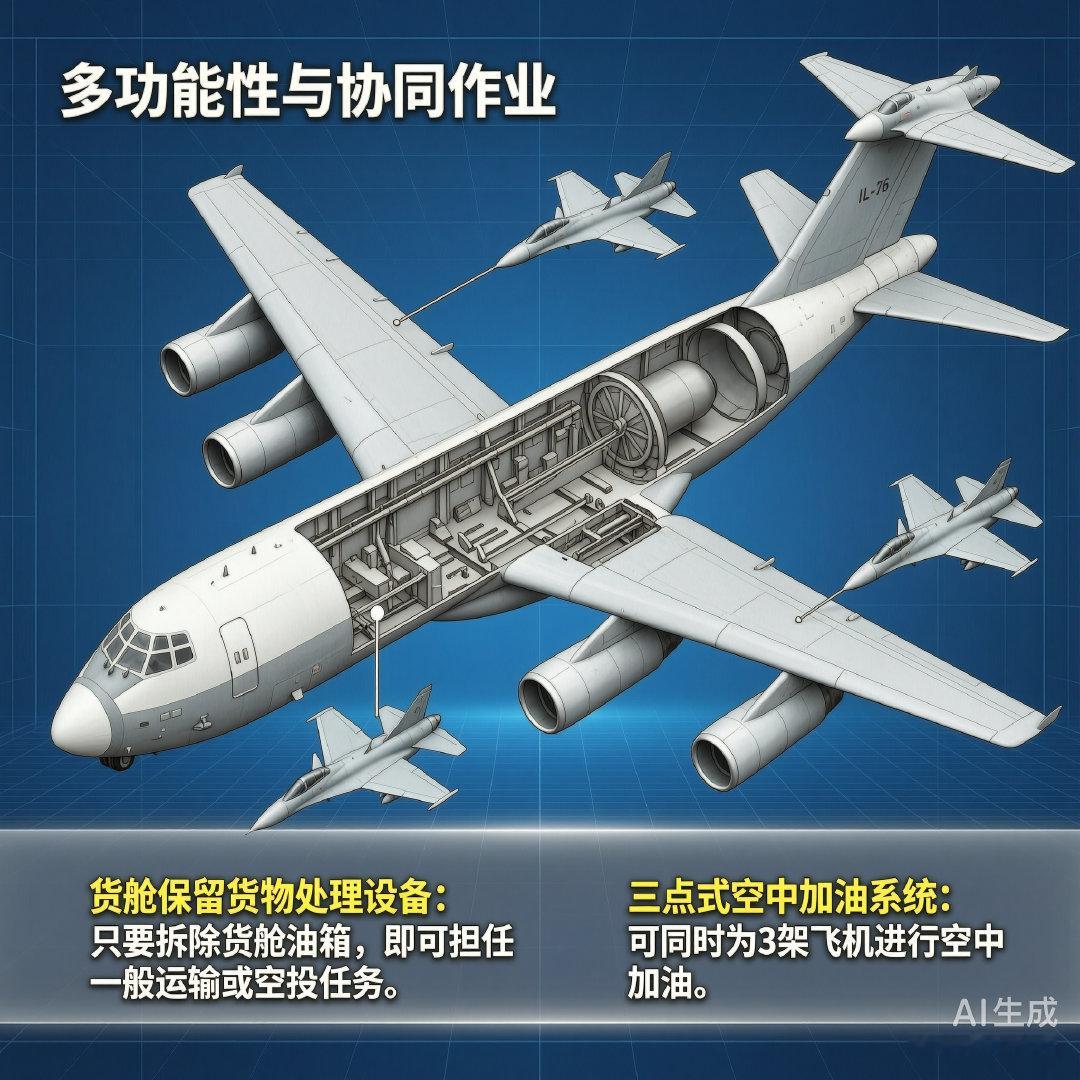 IL-78加油机主要用于给前线及远程战斗飞机及军用运输机进行空中加油,还可以向飞机场紧急运送燃油。由于采用了三点式空中加油系统,IL-78加油机可以同时为3架飞机加油。