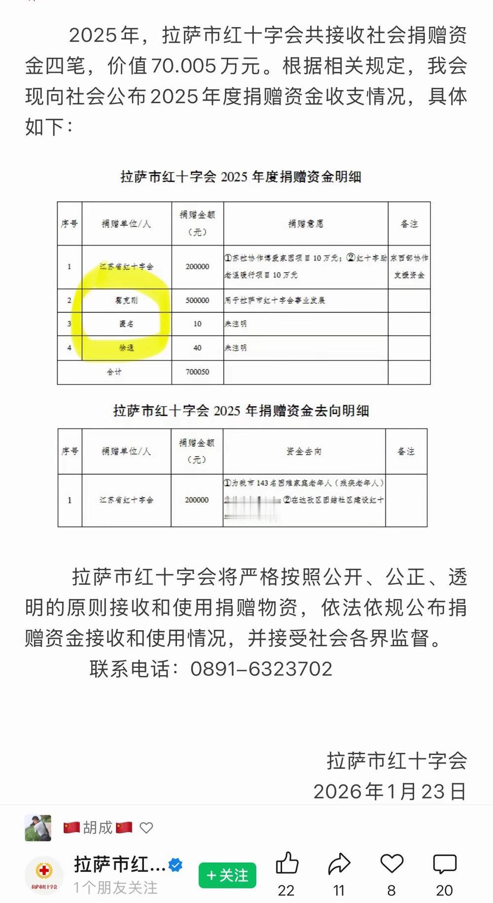 其实这里面有误会,捐款是分两笔走的,1000元是当时紧急捐的,后续的499000元,是后续定向捐的,公示时间不一样,所以一开始没对上。现在官方已经把两笔捐款都公示清楚了,50万捐款实锤到位。