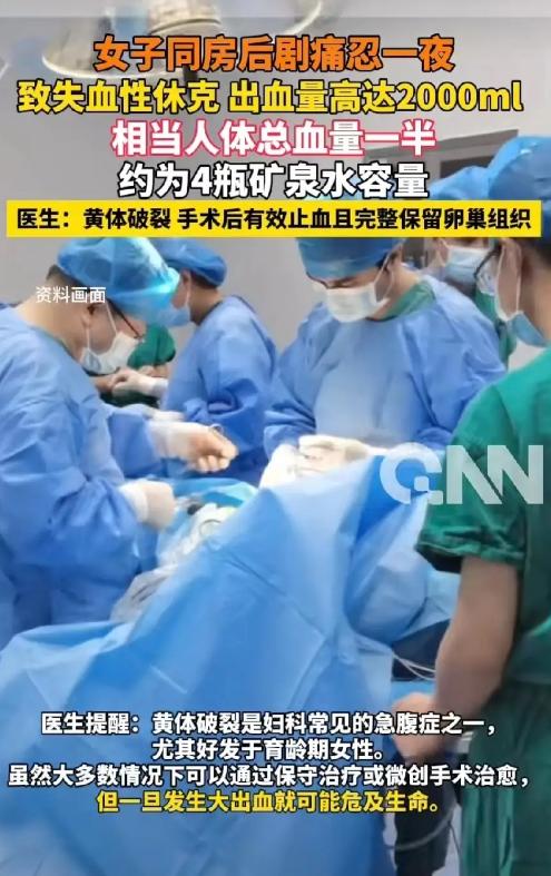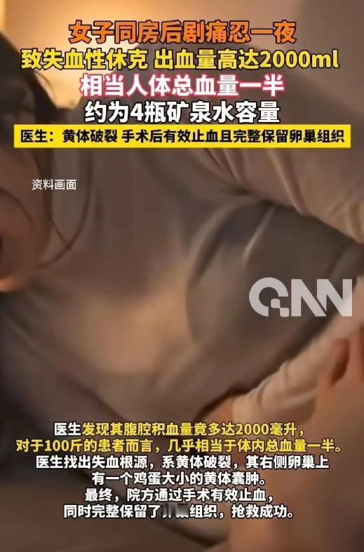 安徽,女子和男友许久未见,见面自然而然发生了亲密关系。谁知,一番恩爱结束后,女子突然腹痛难忍,本以为是动作太大,休息一下就过去了,万万没想到,第二天还疼得她浑身冒冷汗。这下男友急了,赶紧把人送到医院,医生检查发现,女子已经失血性休克,腹部出血量高达2000毫升,有四瓶矿泉水那么多。幸亏医生救治及时,才把人从鬼门关拉回来。网友∶不娶她就对不起她!