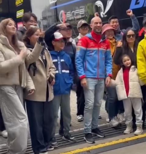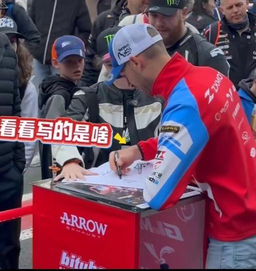 被华人粉丝围得水泄不通求签名,合影留念,他全程耐心十足,来一个签一个,半点车手架子都没有,态度温柔又随和。