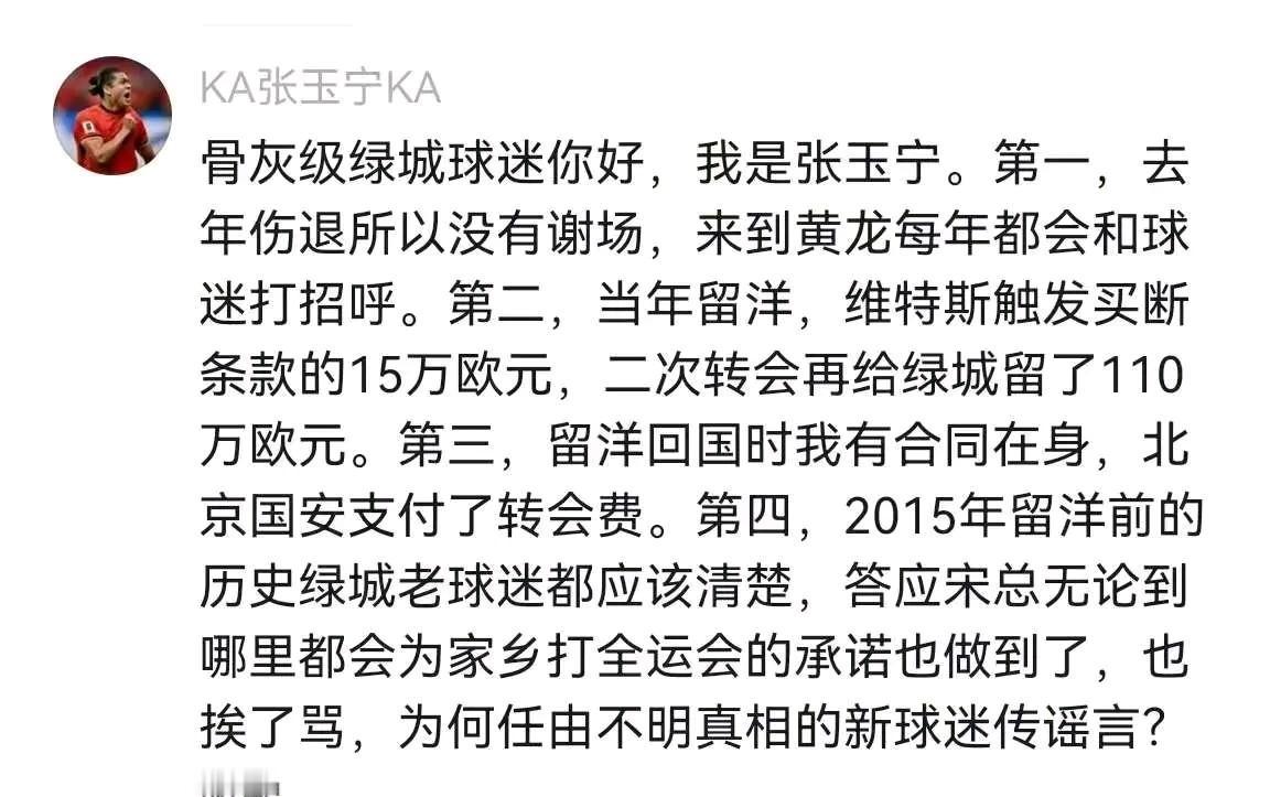 疑似张玉宁账号亲自解释离开浙江、留洋、加盟国安始末,不理解为何被部分浙江球迷骂!