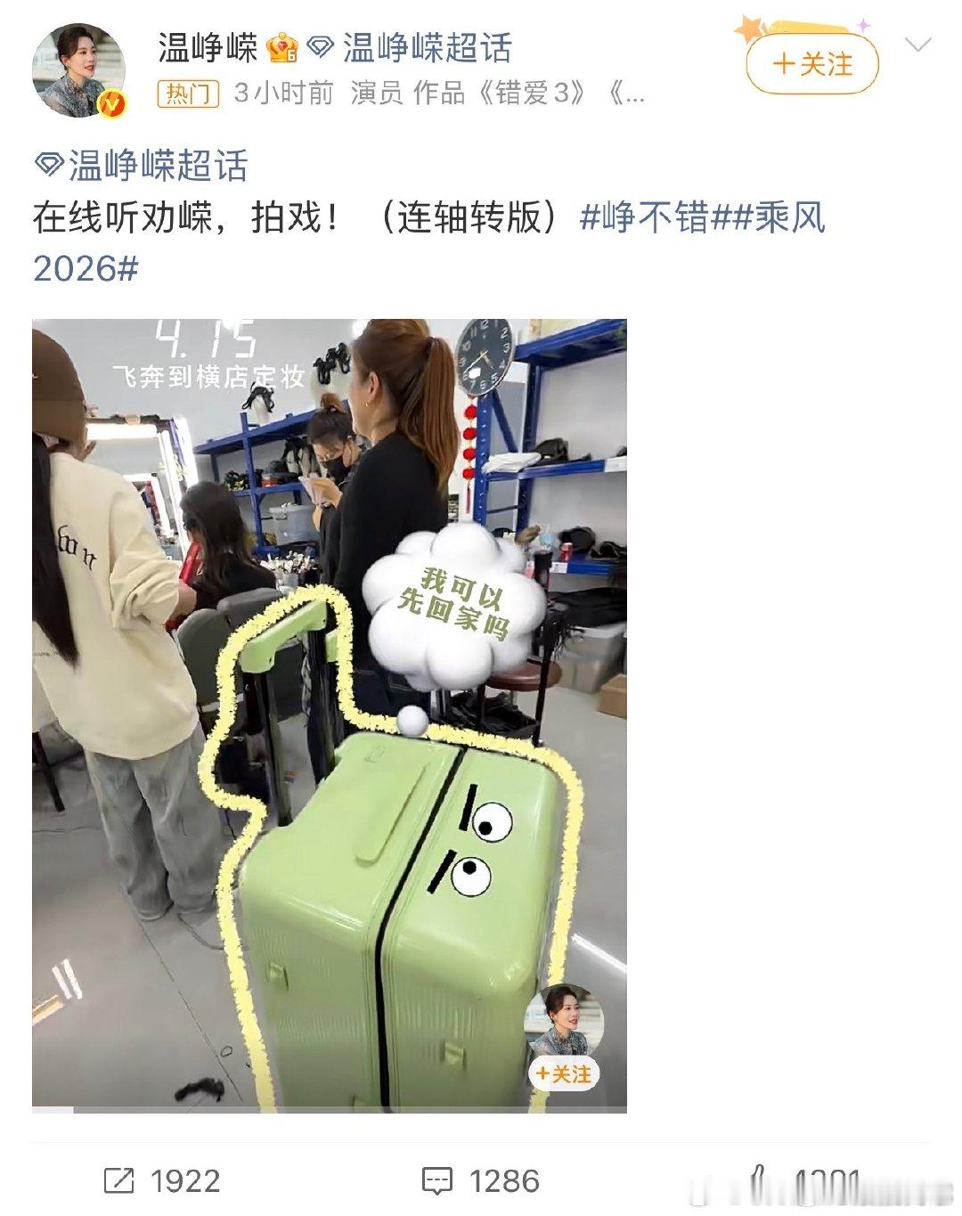 温峥嵘听劝回去拍戏了乘风2026及时止损,专注热爱,温峥嵘回归剧组拍戏,相信她会带来更有质感、更打动人心的角色。