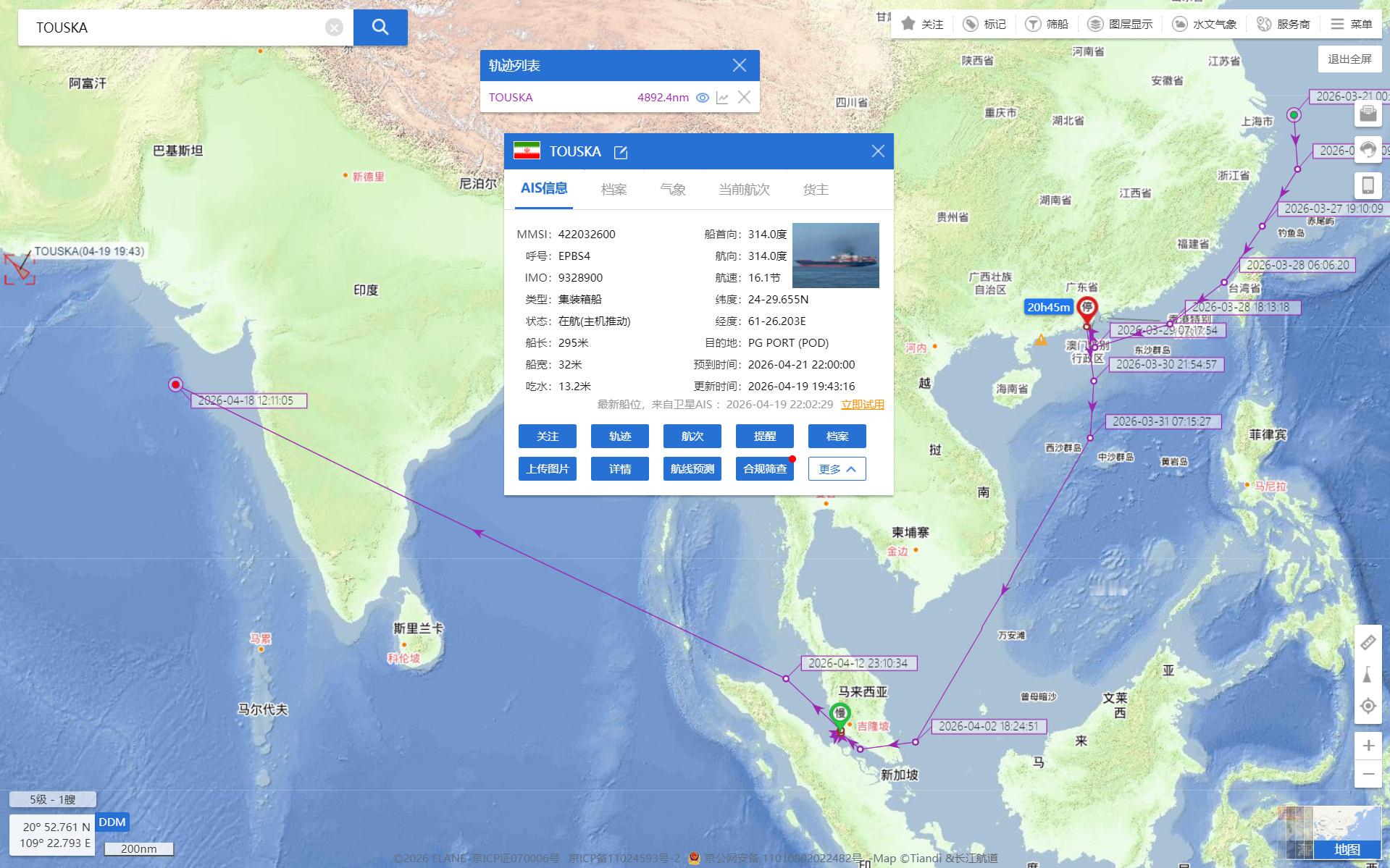 根据船只公开的AIS信号轨迹显示,在阿曼湾遭美军驱逐舰炮击和劫持的伊朗集装箱船“TOUSKA”,是3月20日从上海出发、3月29日左右经停广东珠海载货再次出发的,之后在4月19日被美军击伤和劫持了。