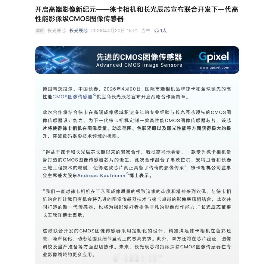 徕卡相机和长光辰芯宣布联合开发下一代高性能影像级CMOS图像传感器