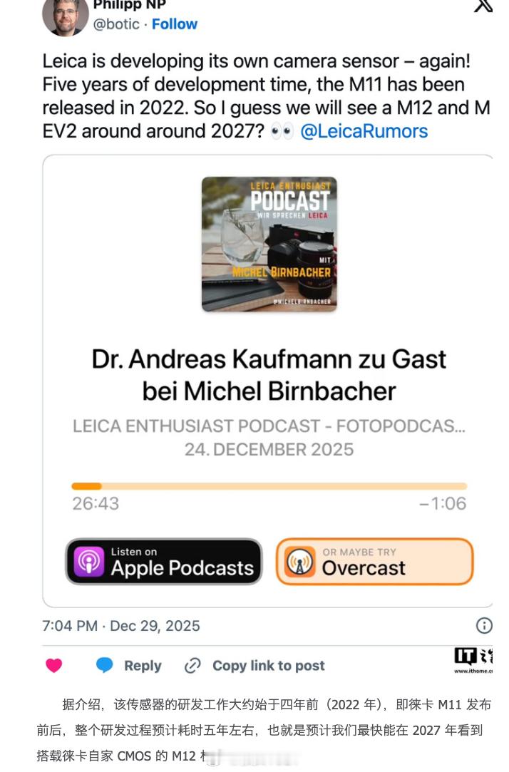 目前在售的全画幅机型主要采用定制版索尼IMX455和IMX410传感器,考夫曼博士去年宣布大概27年上市的M12要用全新自研传感器,很有可能就是现在官宣的这个了