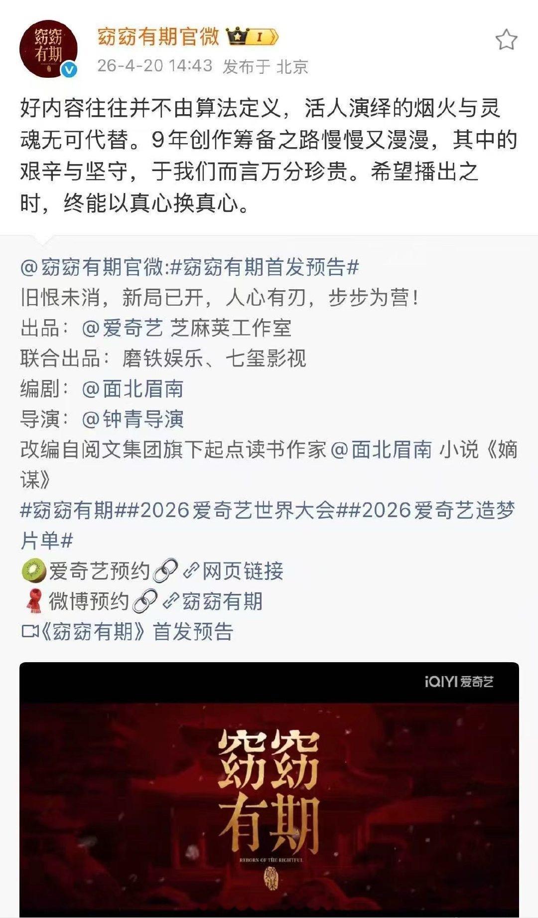 何与、包上恩的窈窈有期 剧组出来发声了,说好内容不能由算法定义,真心换真心。原书作者也发博:前后9年筹备,长剧创作不易爱奇艺爱奇艺 穷疯了也得有底线