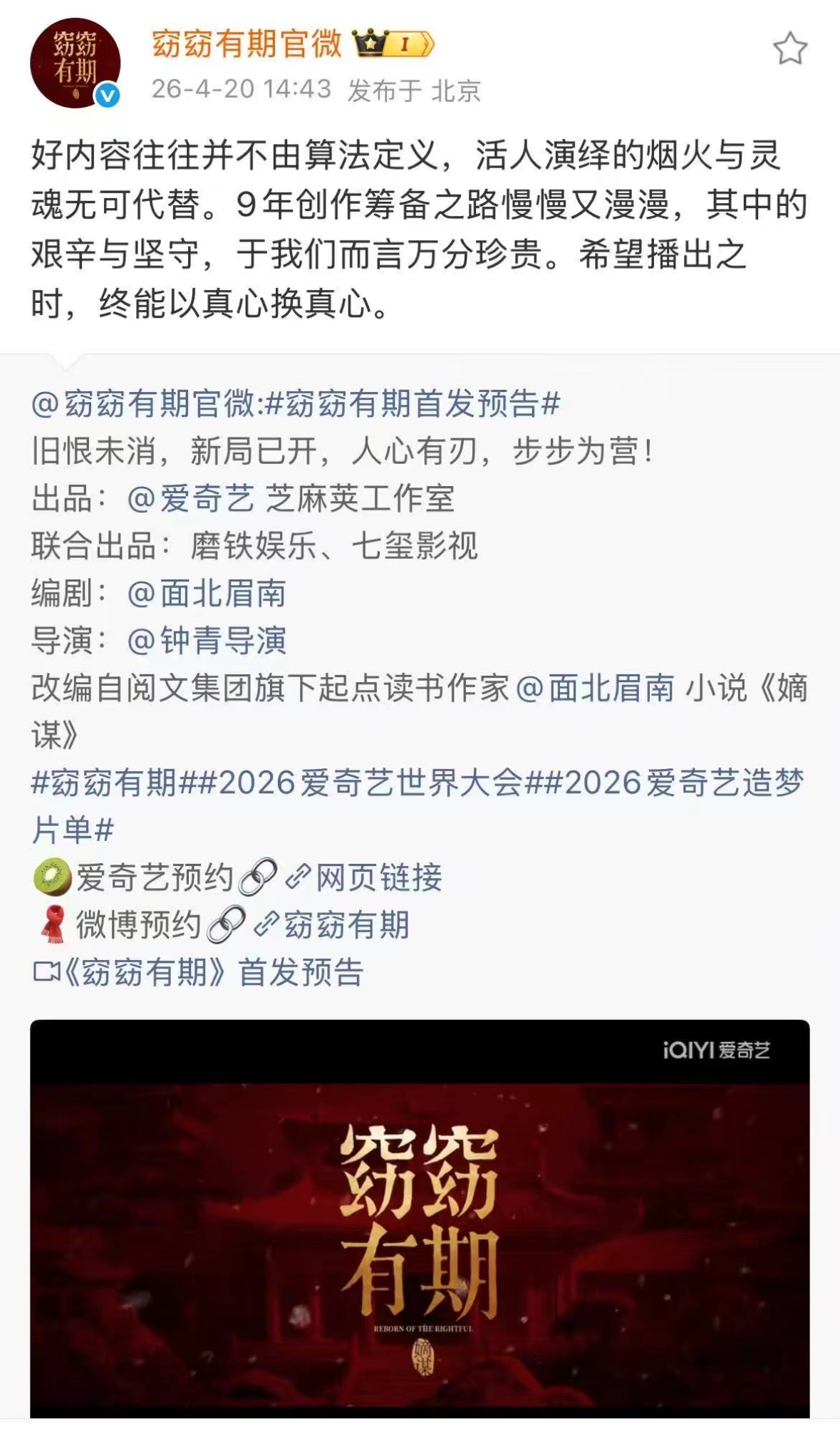 《窈窈有期》官微发文,第一个出来硬刚平台ai的长剧官方。“好内容往往并不由算法定