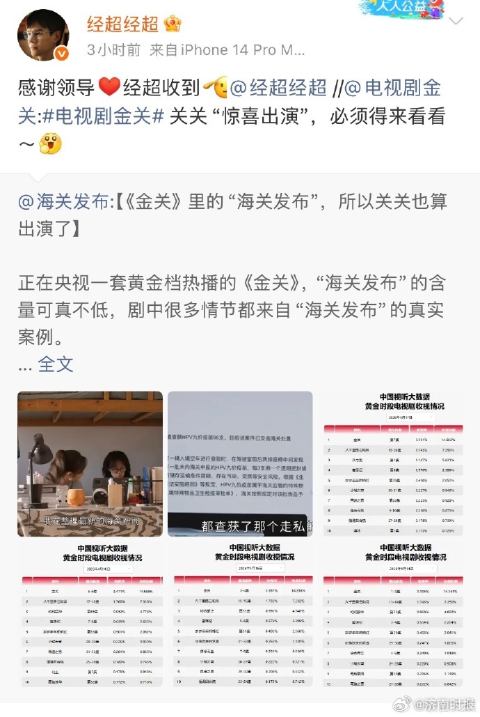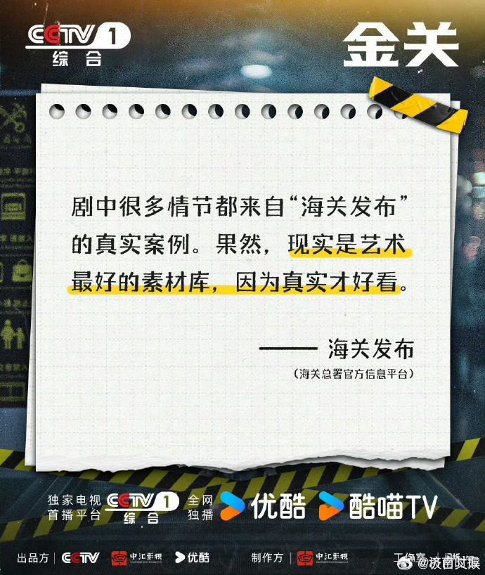 【#海关总署办公厅认证经超新剧# 】据极目文娱报道:经超主演的新剧《金关》首次深度呈现海关旅检日常工作,剧情基于真实案例改编。海关总署办公厅官方微博还发了该剧相关内容:《金关》里的“海关发布”,所以关关也算出演了!据悉,不少观众提到,看了这部剧,还真的对海关工作有了更多的了解——一线海关工作人员在方寸通道间守护国门安全的专业、担当与坚守,值得被记住。
