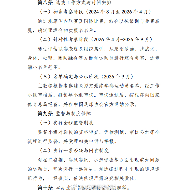 国足亚运队将采用一票否决机制 4月20日,中国足协通过官方渠道公示了《2026年爱知-名古屋亚运会参赛运动员选拔办法(男子足球)》。选拔工作初步考察阶段自2024年8月开始至本月完成,意味着目前中国足协与U23国足教练组已通过前期观摩国内联赛及国际比赛,结合球员在以往本队集训与比赛中的表现,确定亚运会初次报名名单。对候选球员针对性考察阶段将从本月开始至今年9月亚运会开赛前完成。根据这套“办法”,选拔工作组将对在兴奋剂、赛风赛纪、思想道德等方面出现重大问题的运动员,坚决实行一票否决