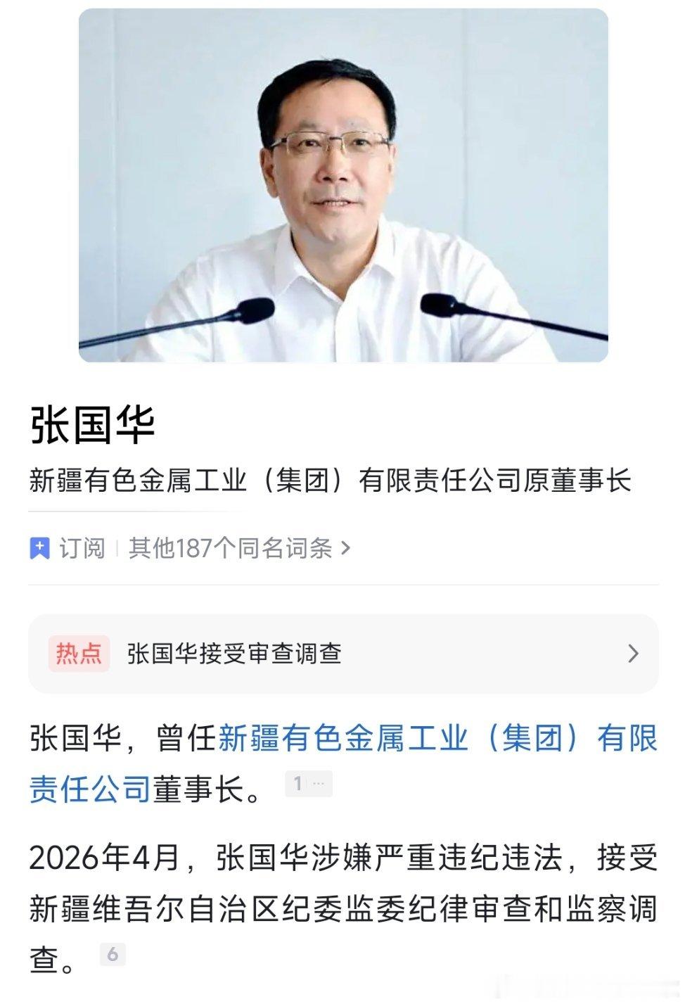 新疆有色金属工业(集团)有限责任公司董事长张国华被查。