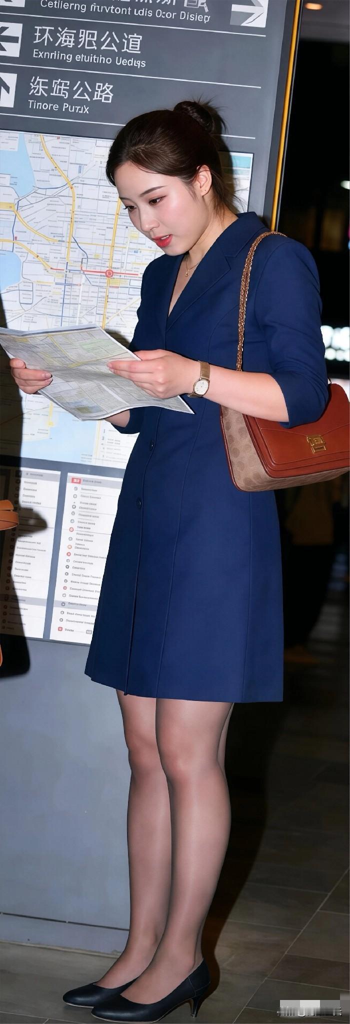 藏蓝色西装式连衣裙,V字翻领设计,七分袖露出手腕,修身版型勾勒匀称身材,尽显干练气质。搭配尖头细跟高跟鞋,瞬间拉长腿部线条,气场十足。棕色与浅棕色拼接单肩包,金色链条与金属扣饰增添精致感,整体造型优雅又不失时尚,适合职场或正式场合。