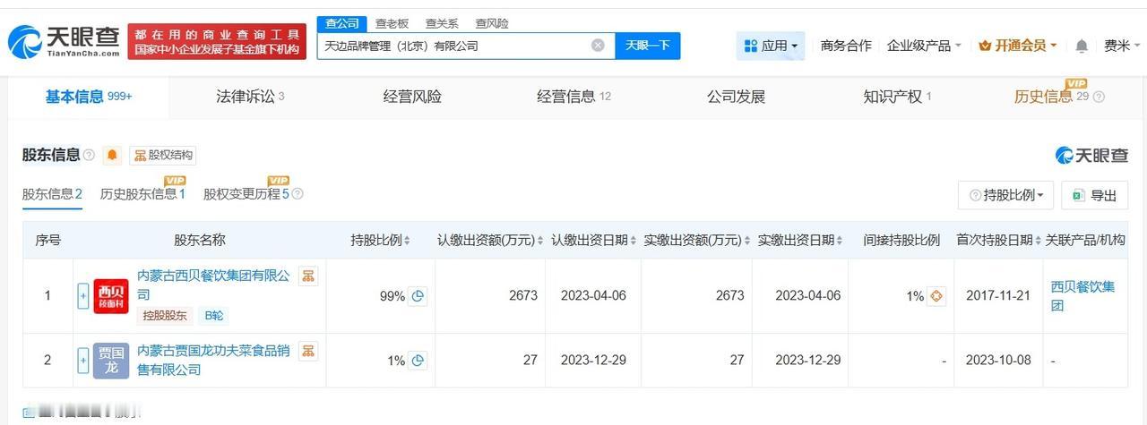 该公司成立于2016年1月,注册资本2700万人民币,经营范围包括餐饮管理、日用品销售、玩具销售等,由内蒙古西贝餐饮集团有限公司、内蒙古贾国龙功夫菜食品销售有限公司共同持股。