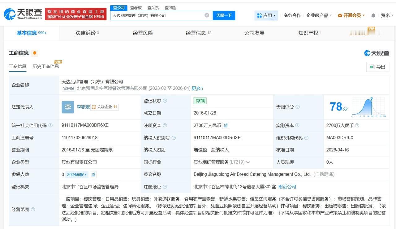 天眼查App显示,近日,北京贾国龙空气馍餐饮管理有限公司发生工商变更,企业名称变更为天边品牌管理(北京)有限公司,同时,付国卸任法定代表人、执行董事、经理,李志宏接任法定代表人并担任董事。