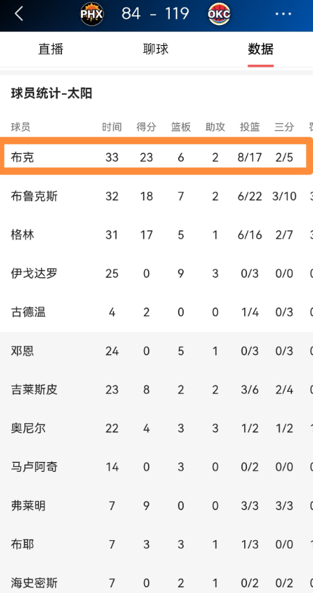 全场比赛下来,布克首发出战33分钟,投篮17中8,其中三分球5中2、罚球7中5空砍23分,外加6篮板2助攻。