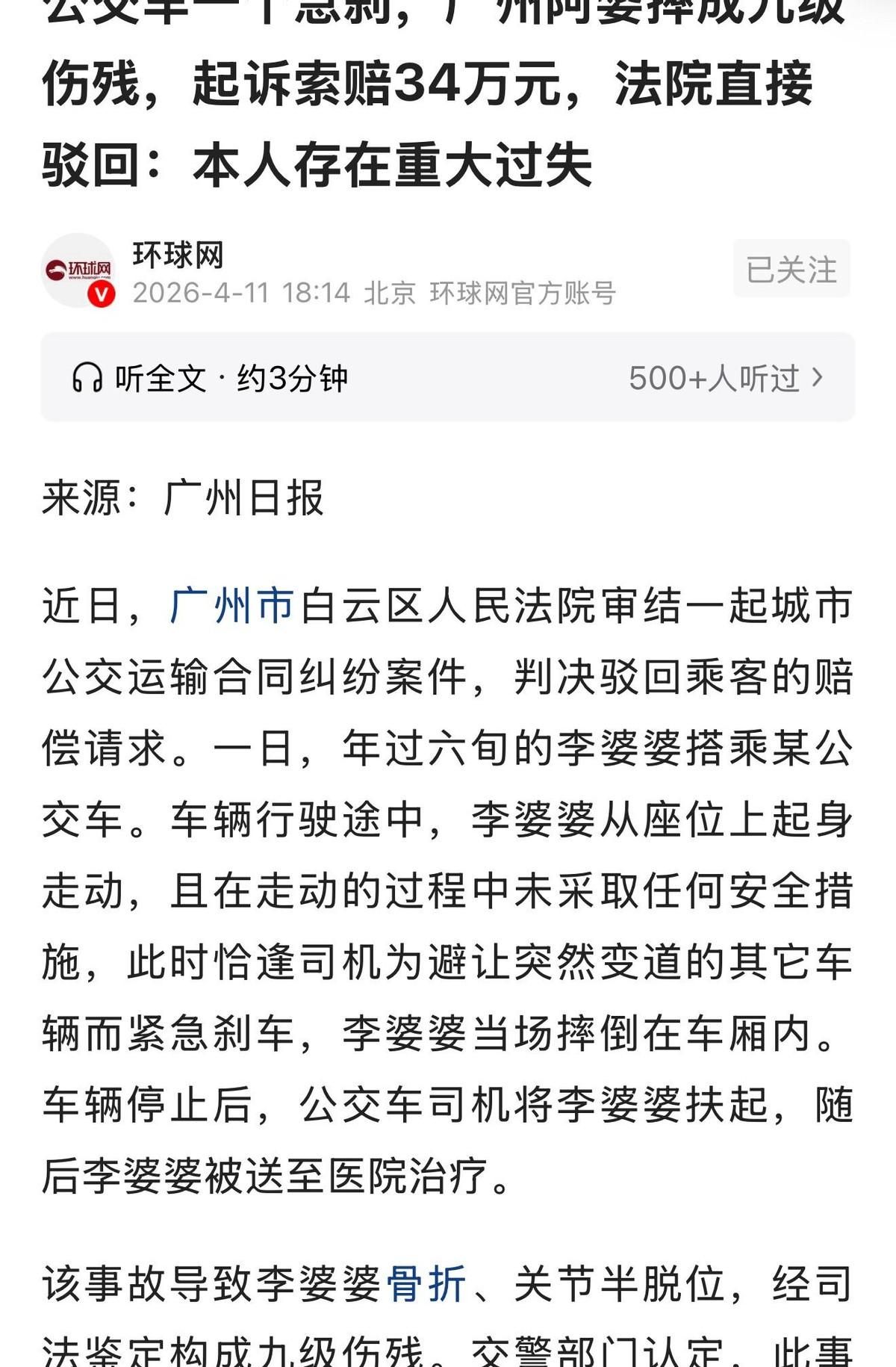 广州发生了一件让人意想不到的事儿!一位60多岁的老太太坐公交车时,因为在车厢里随意走动,结果摔成了九级伤残!老太太把司机和公交公司都告上了法庭,要求赔偿34万多元,可法院最后的判决,让很多人都没想到!
