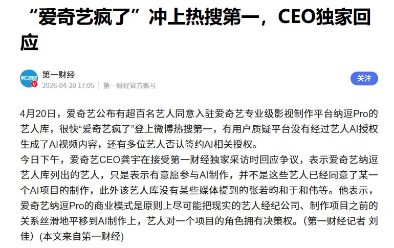 针对此事,爱奇艺CEO龚宇回应称:“爱奇艺纳逗艺人库列出的艺人,只是表示有意愿参与AI制作,并不是这些艺人已经同意了某一个AI项目的制作。”