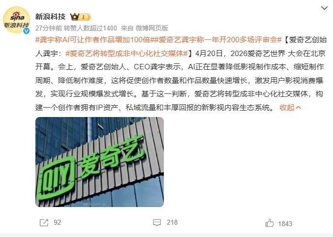 互联网消息指出,爱奇艺CEO龚宇在“2026爱奇艺世界·大会”上表示:AI正在显著降低影视制作成本、缩短制作周期、降低制作难度,这将促使创作者数量和作品数量快速增长,激发用户影视消费爆发,实现行业规模爆发式增长。
