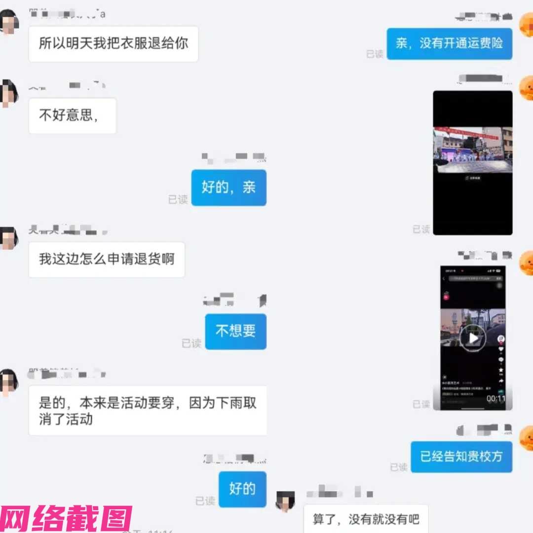 只是后来还是发生了店主的担忧,家长们退货了,二十套货中有十一套要求七天无理由退货,家长们给出的解释,为本有进行的活动取消了,但实际上店主收到退货后,看见里面的衣服已是全部穿试过,上面带有污渍,为此店主还特意上网,看到了这所学校的活动图片,明明上面演出的服饰,全部是穿的自己发过去的演出服。