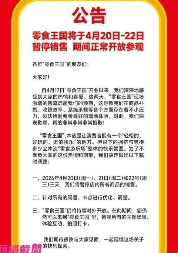 如今开业三天却被通告停止销售,方便补货,但可在内参观打卡游逛,就是不能买东西,面对如此的场景是看到零食王国的魅力确实无穷,这也是为方便零食爱好者有个喘息的机会再来选购。