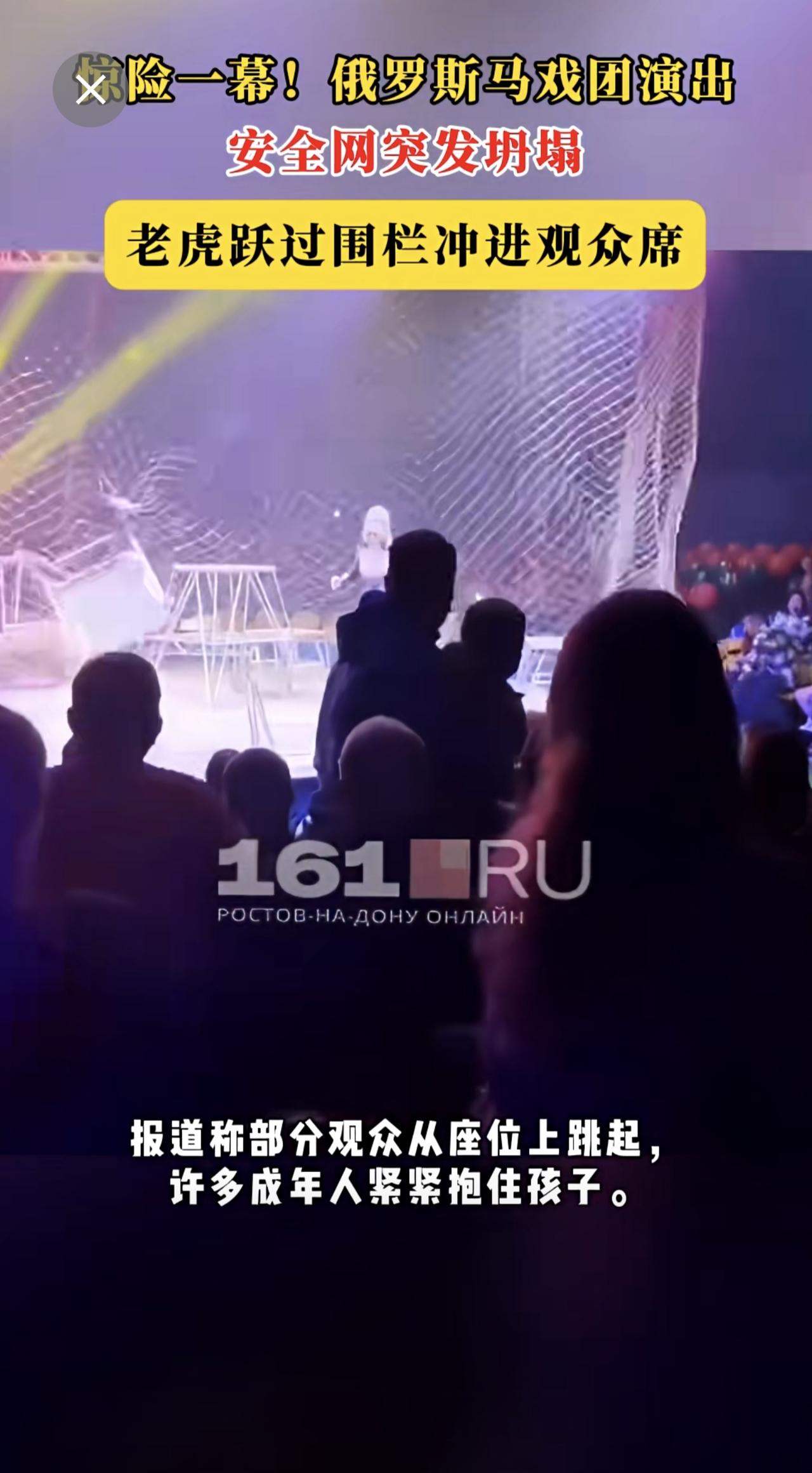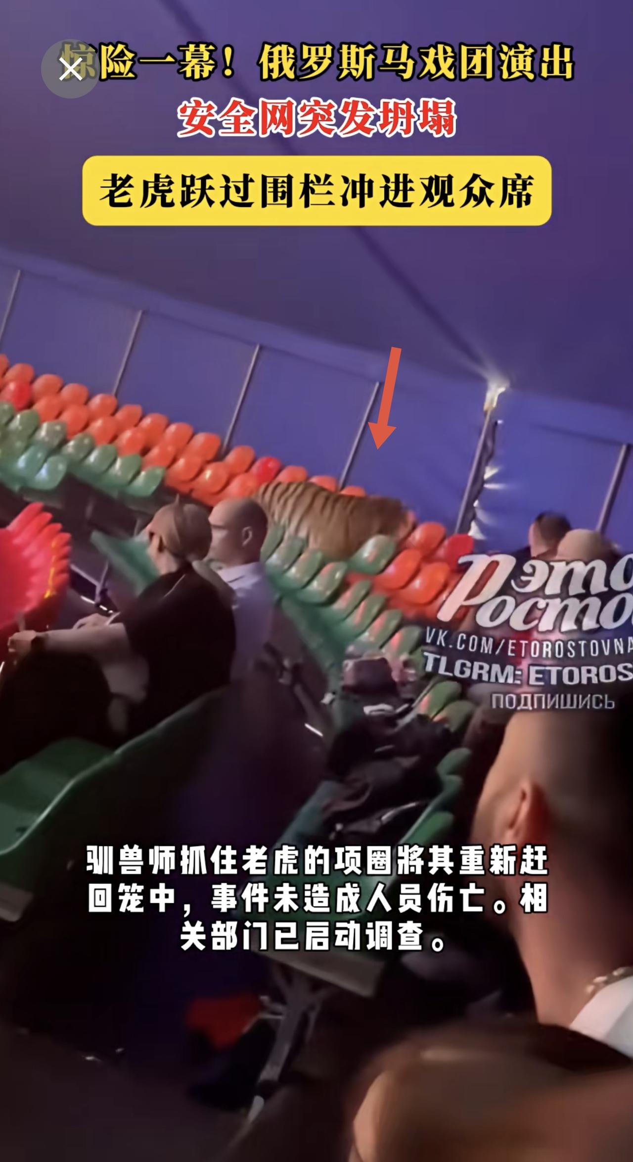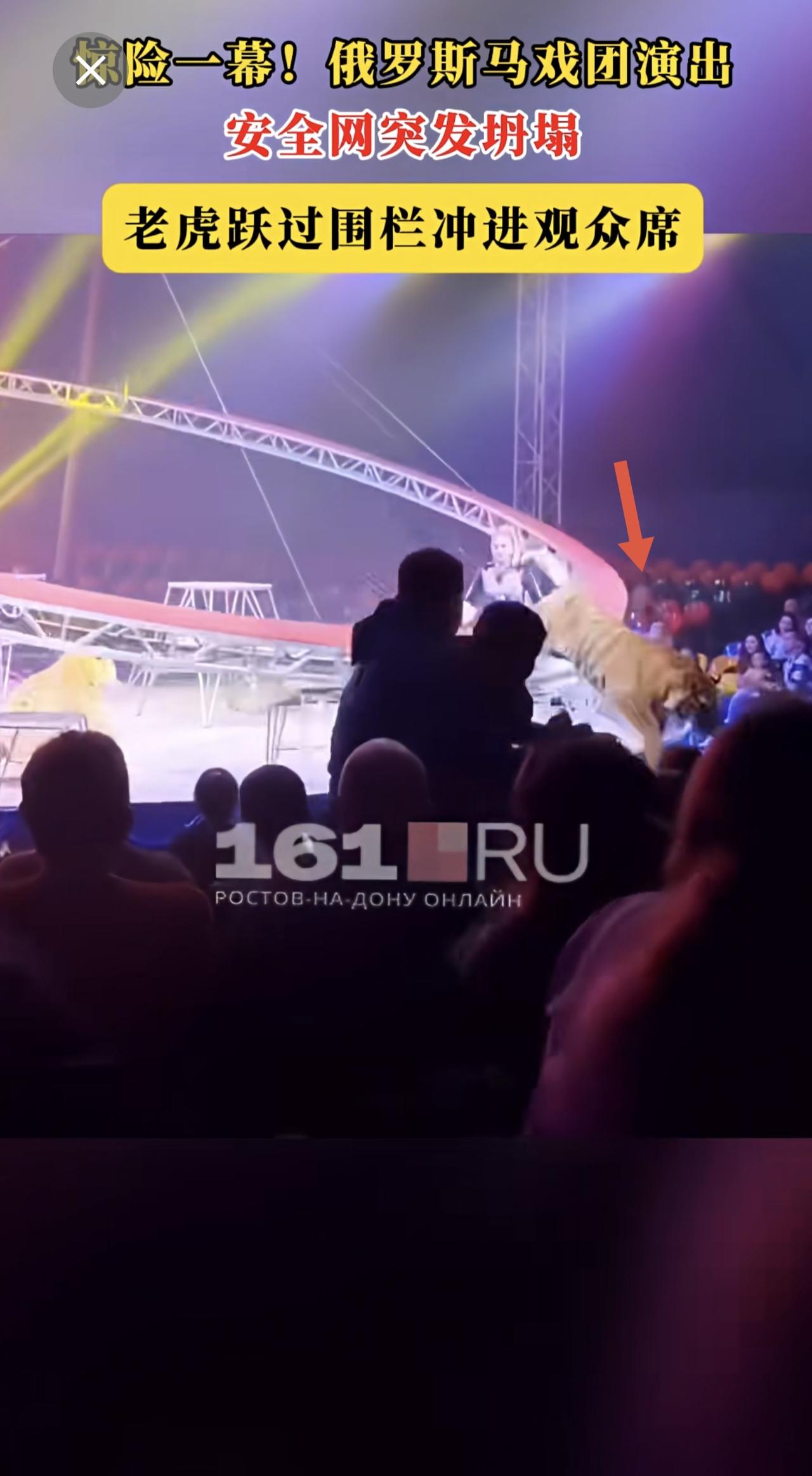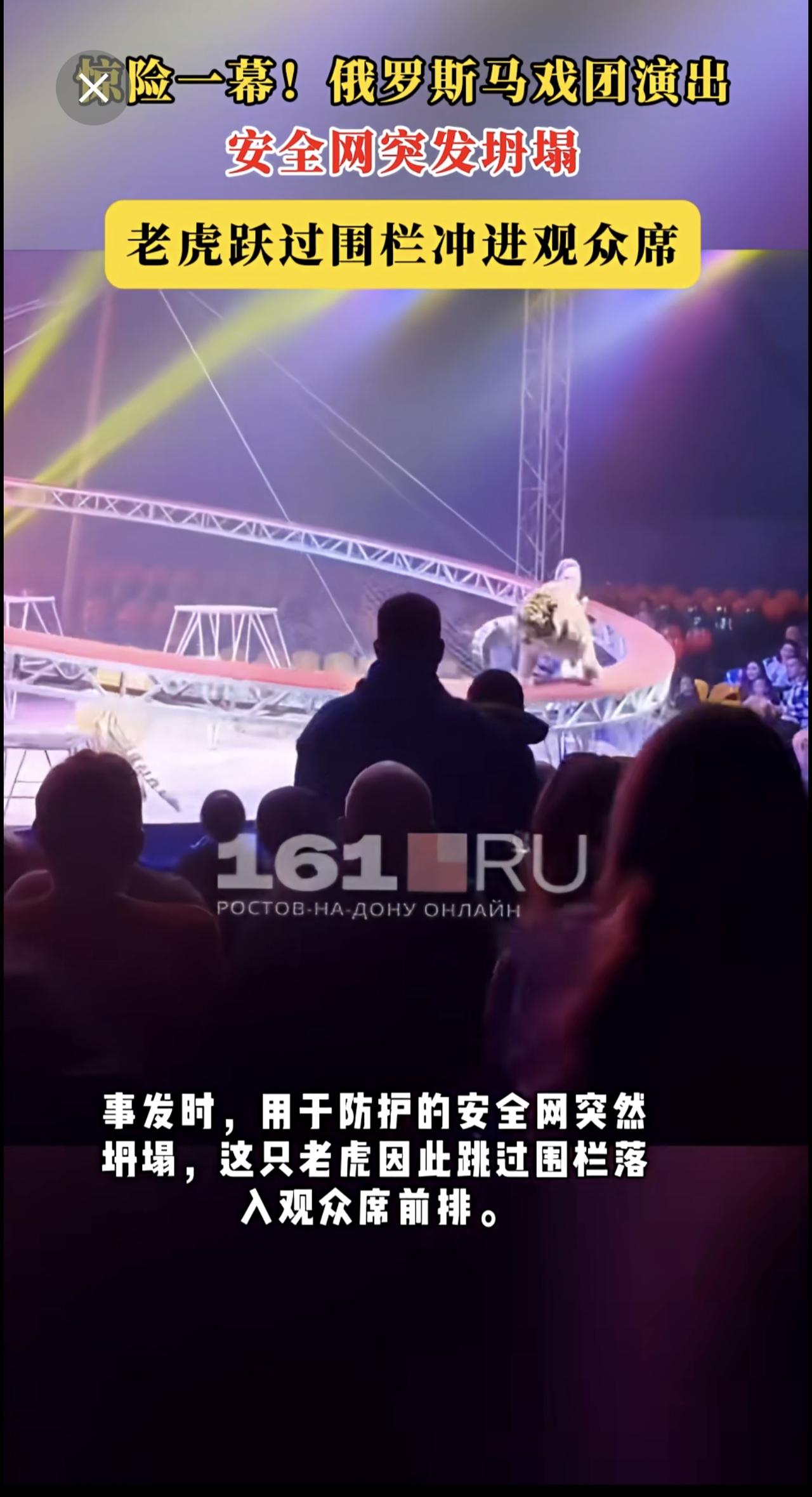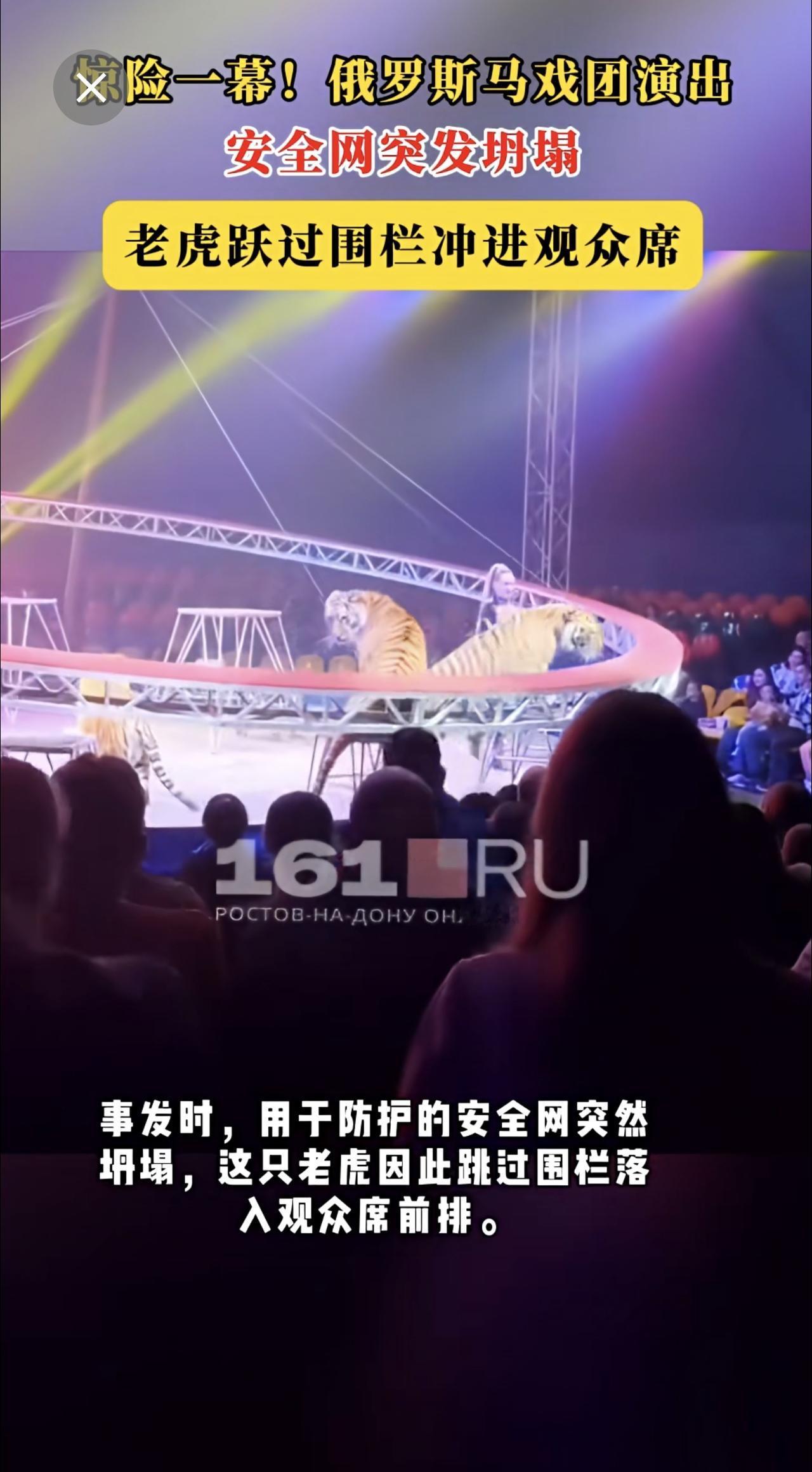 惊险一幕!俄罗斯马戏团演出安全网突发坍塌,老虎跃过围栏冲进观众席