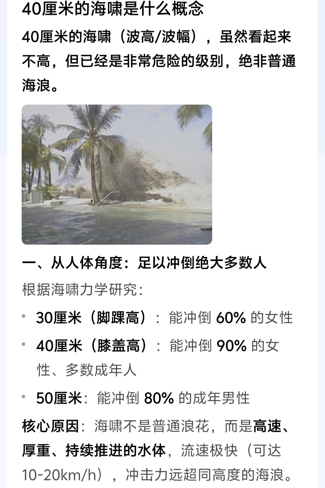 40厘米的海啸是以波高、波幅计算的,足以冲倒90%的女性及多数成年人。达到50厘米时,就足以冲倒80%的成年男性。