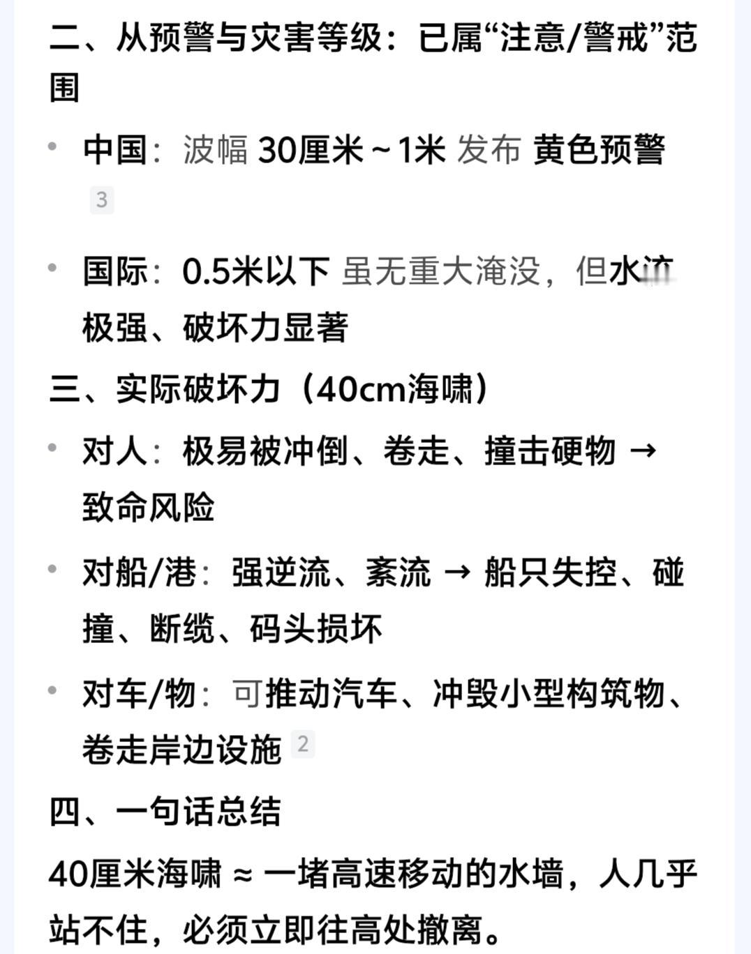 另外,海啸不同于普通海浪,它具有厚重、高速且持续推进的水体,在预警与灾害等级上,40厘米海啸已属于警戒范围。