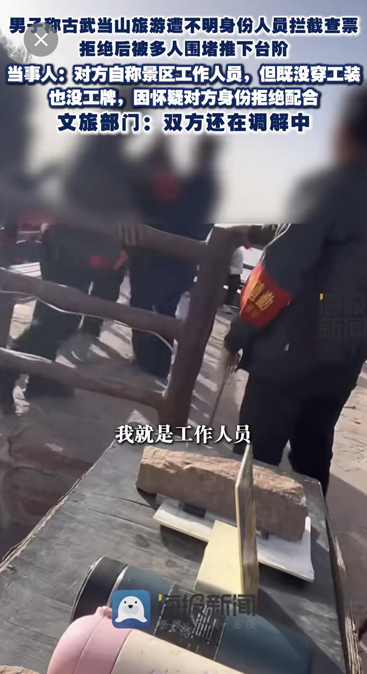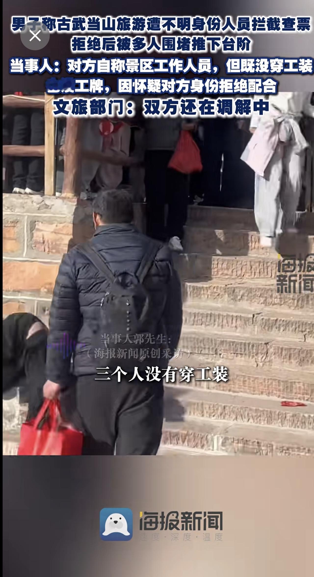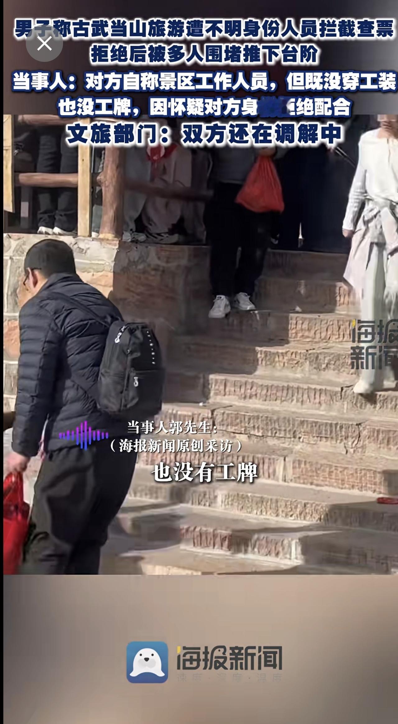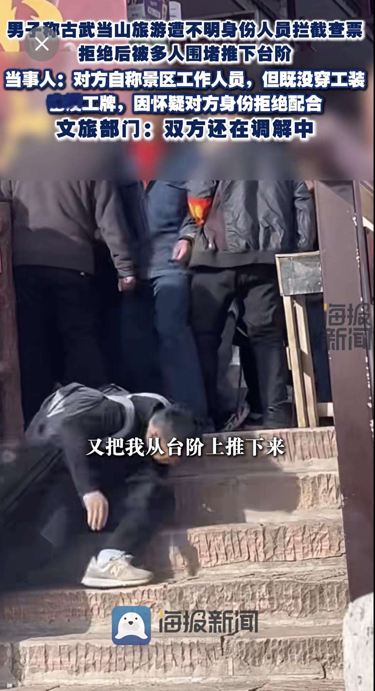 男子称古武当山旅游遭不明身份人员拦截查票,拒绝后被推下台阶,文旅部门回应:双方还