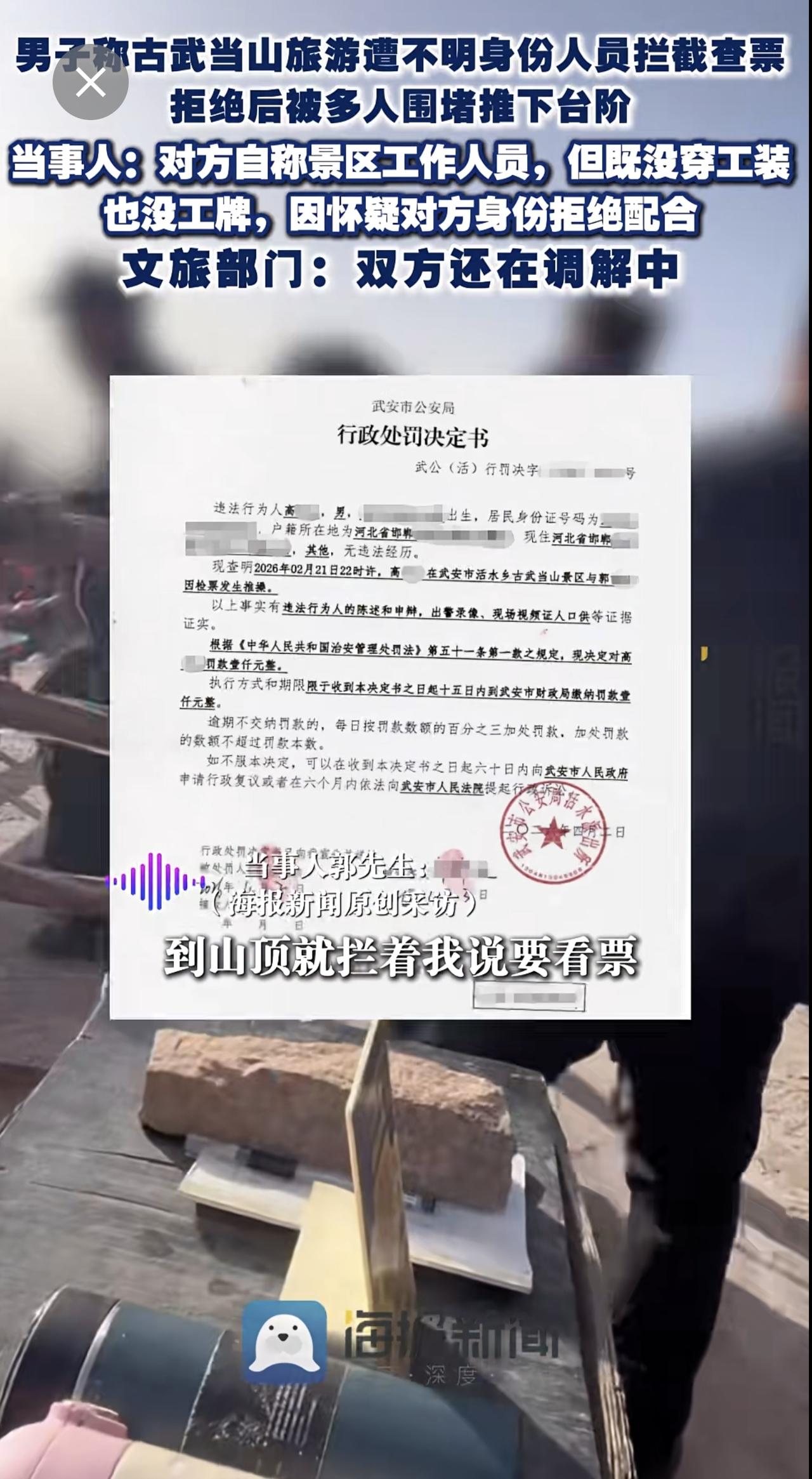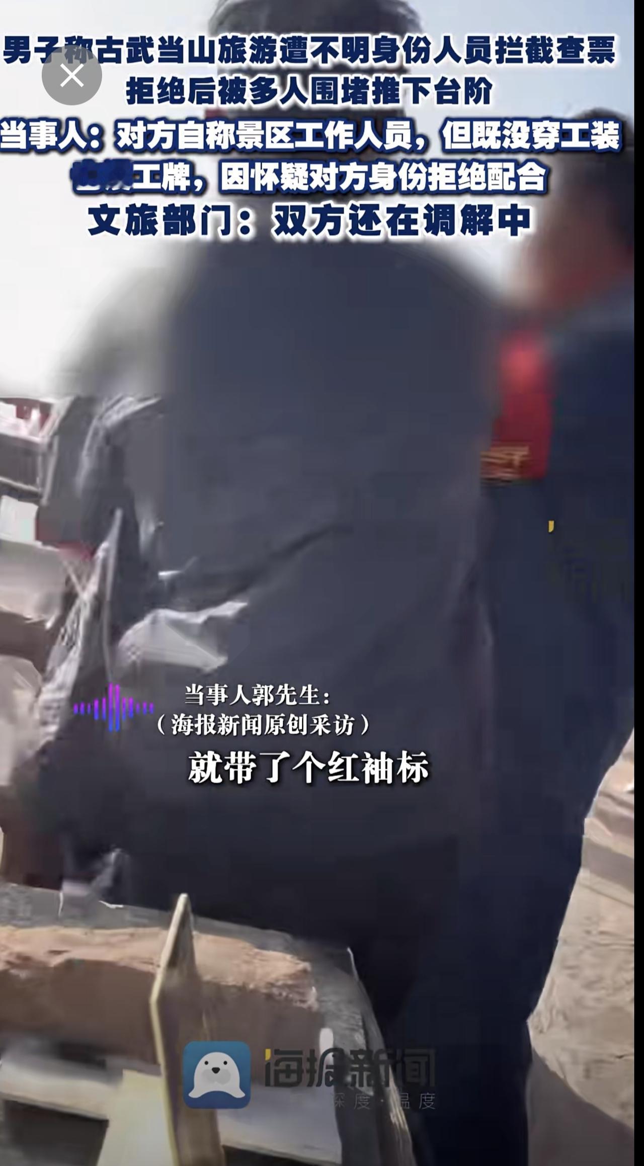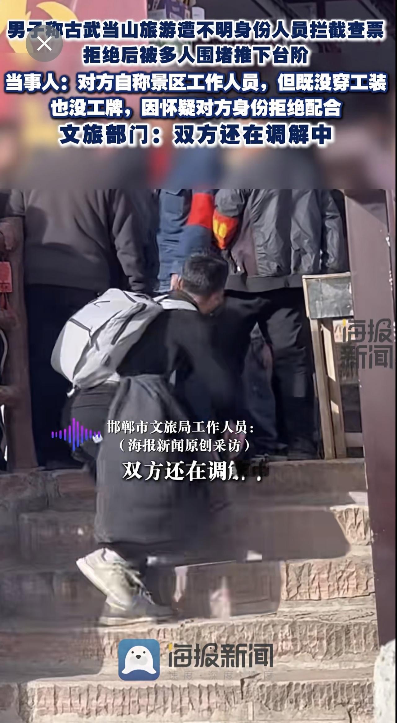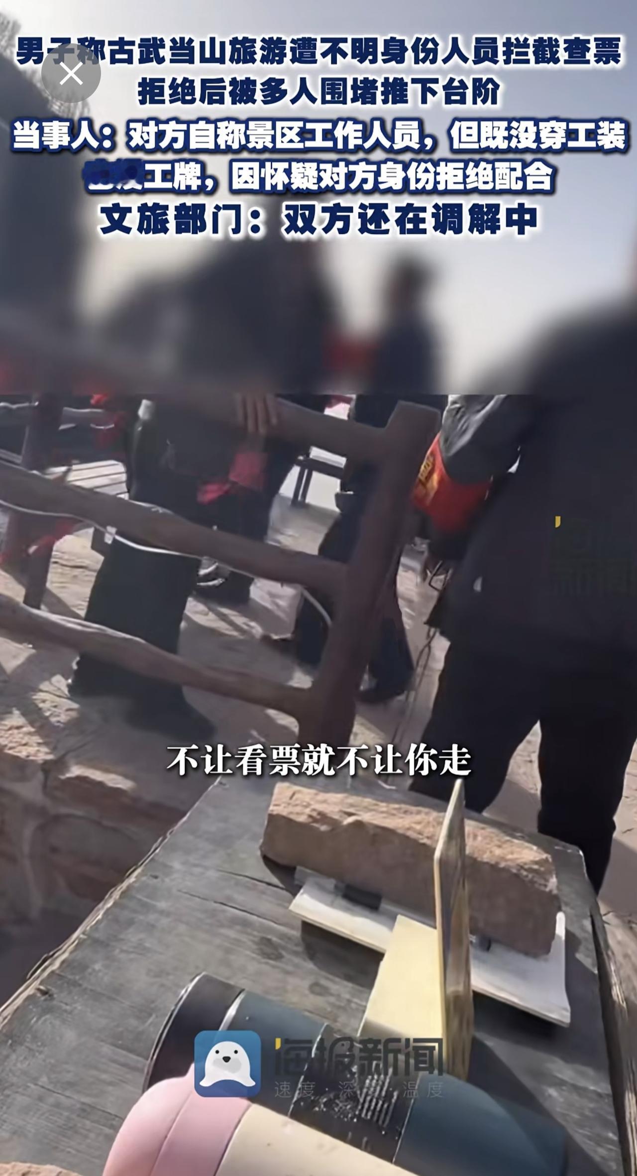 男子称古武当山旅游遭不明身份人员拦截查票,拒绝后被推下台阶,文旅部门回应:双方还