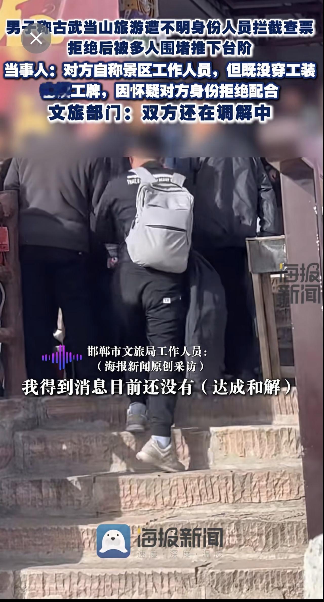 男子称古武当山旅游遭不明身份人员拦截查票,拒绝后被推下台阶,文旅部门回应:双方还在调解中热点新闻事件 热点追踪